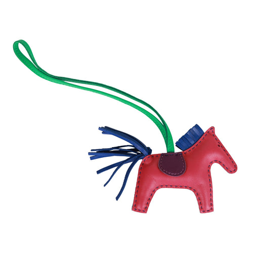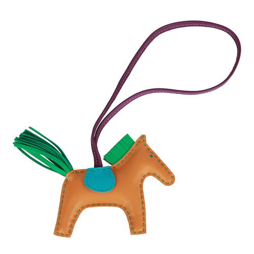 This reversible Grigri Rodeo bag charm is in Bleu Aztec milo lambskin leather and accented with a Bleu Electric mane, tail and stitching, and a Soufre saddle, the opposite side is made of Rose Shocking milo lambskin and accented with a Violet...