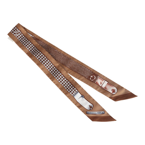 This silk twilly is in Marron, Glace, and Gris.This style was designed by Cathy Latham.Fabric: SilkOrigin: FranceCondition: New and never wornAccompanied by: Boxes, caretag, ribbonMeasurements: 32" x 2"
