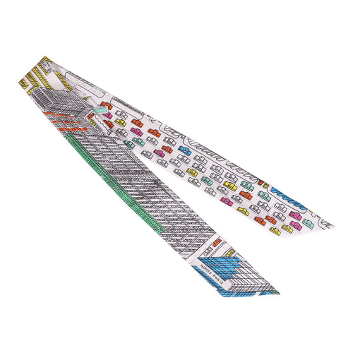 Hermes "Parade en Fanfare" silk twilly designed by Tong Ren in a cool toned multi colorway.