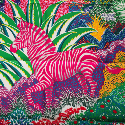 Hermes "Mountain Zebra" silk twill scarf by Alice Shirley in a fuchsia colorway.