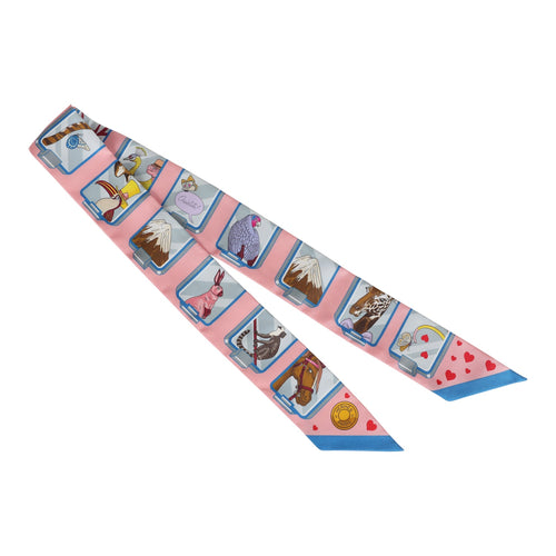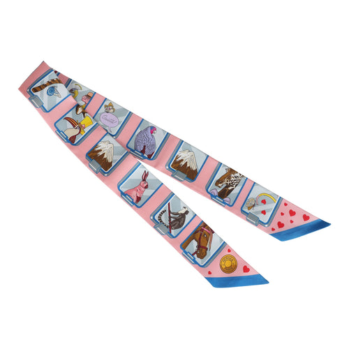 Hermes "Story" Rose, Bleu, Jaune silk Twilly in a pink multi colorway.Designed by Jonathan Burton.
