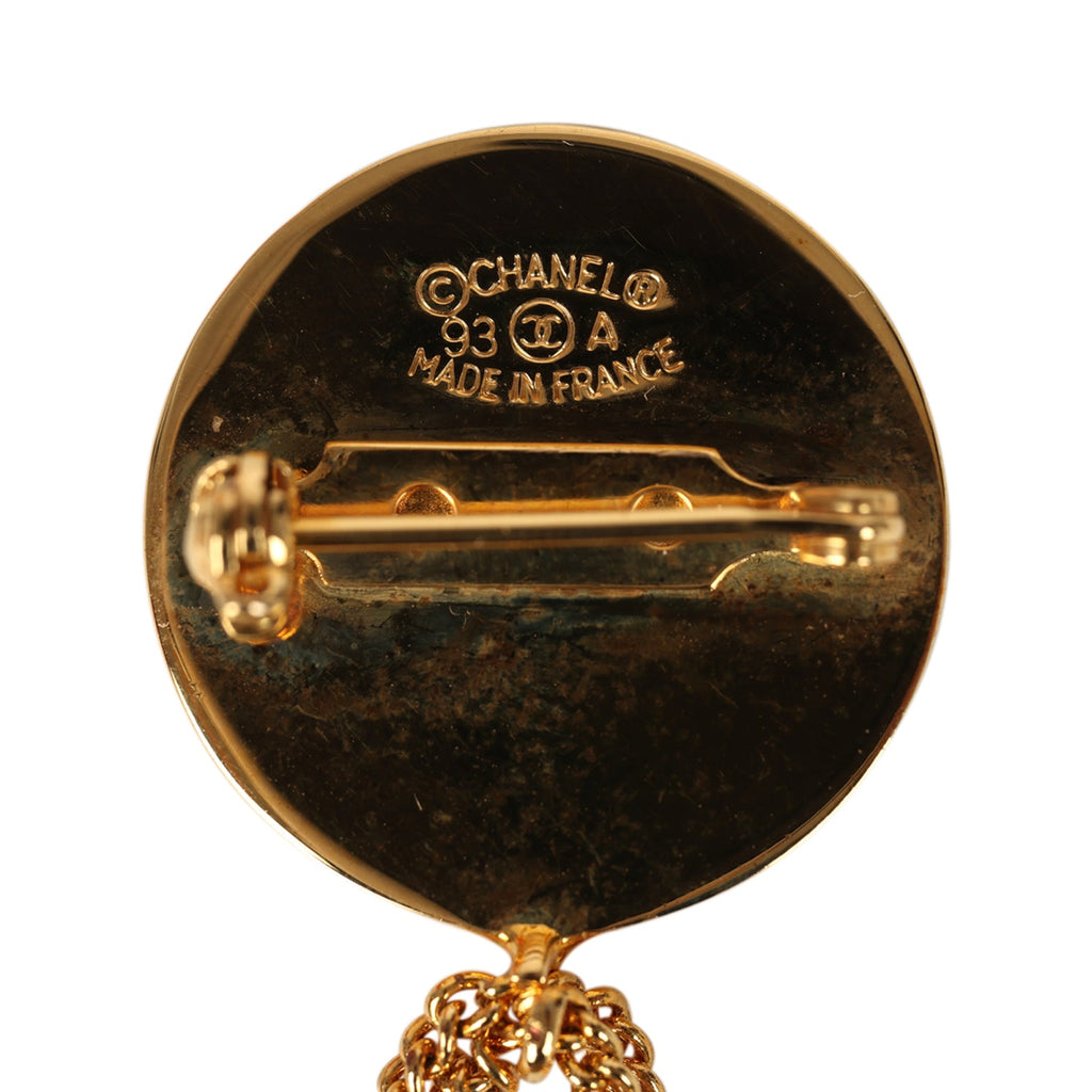 This vintage  Chanel Rue Cambon Dangle Flap Bag Brooch with gold tone hardware, features a round Rue Cambon coin with a dangling quilted gold tone flap bag with a pin back closure.
