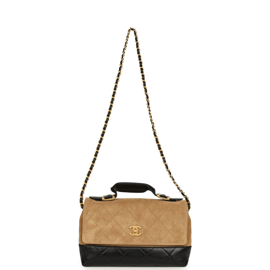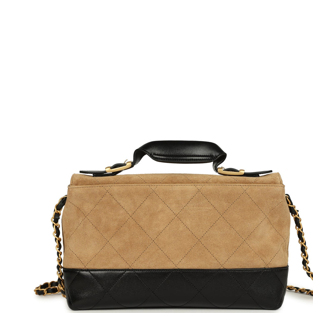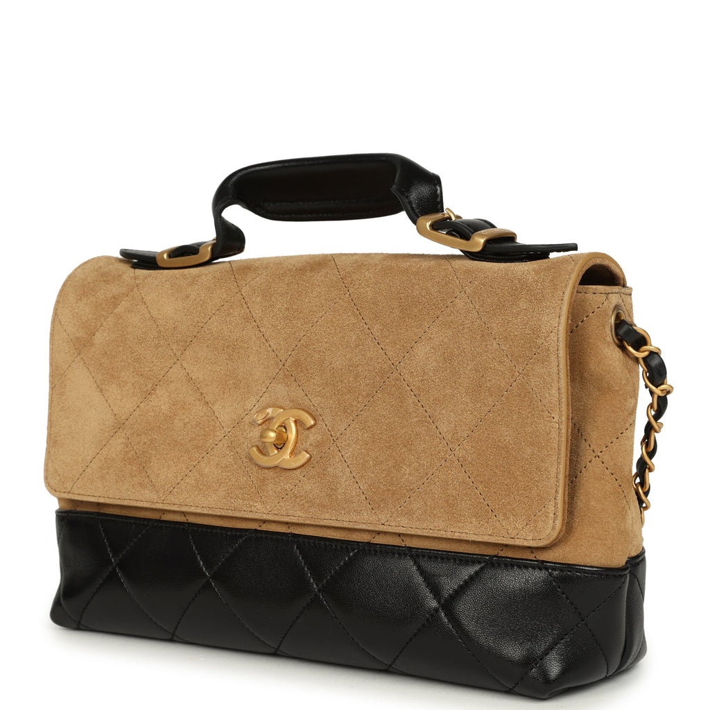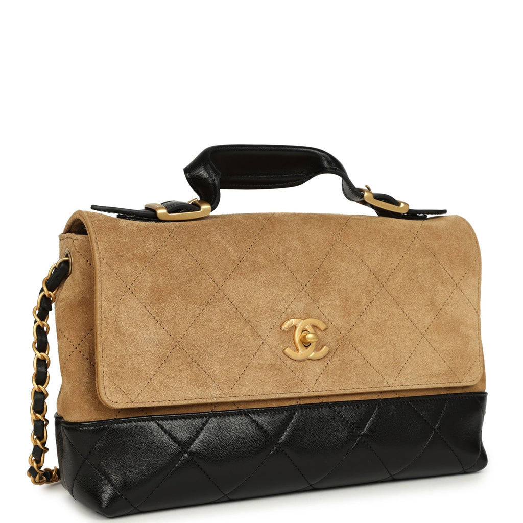 Chanel Coco Base Top Handle Flap Bag Brown Suede and Black Shiny Lambskin Brushed Gold Hardware
