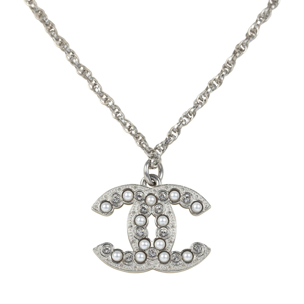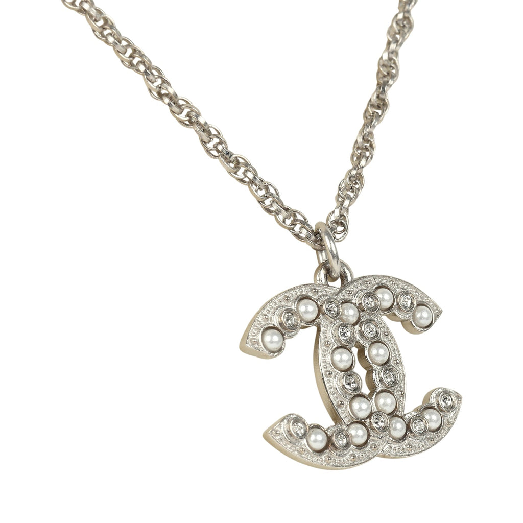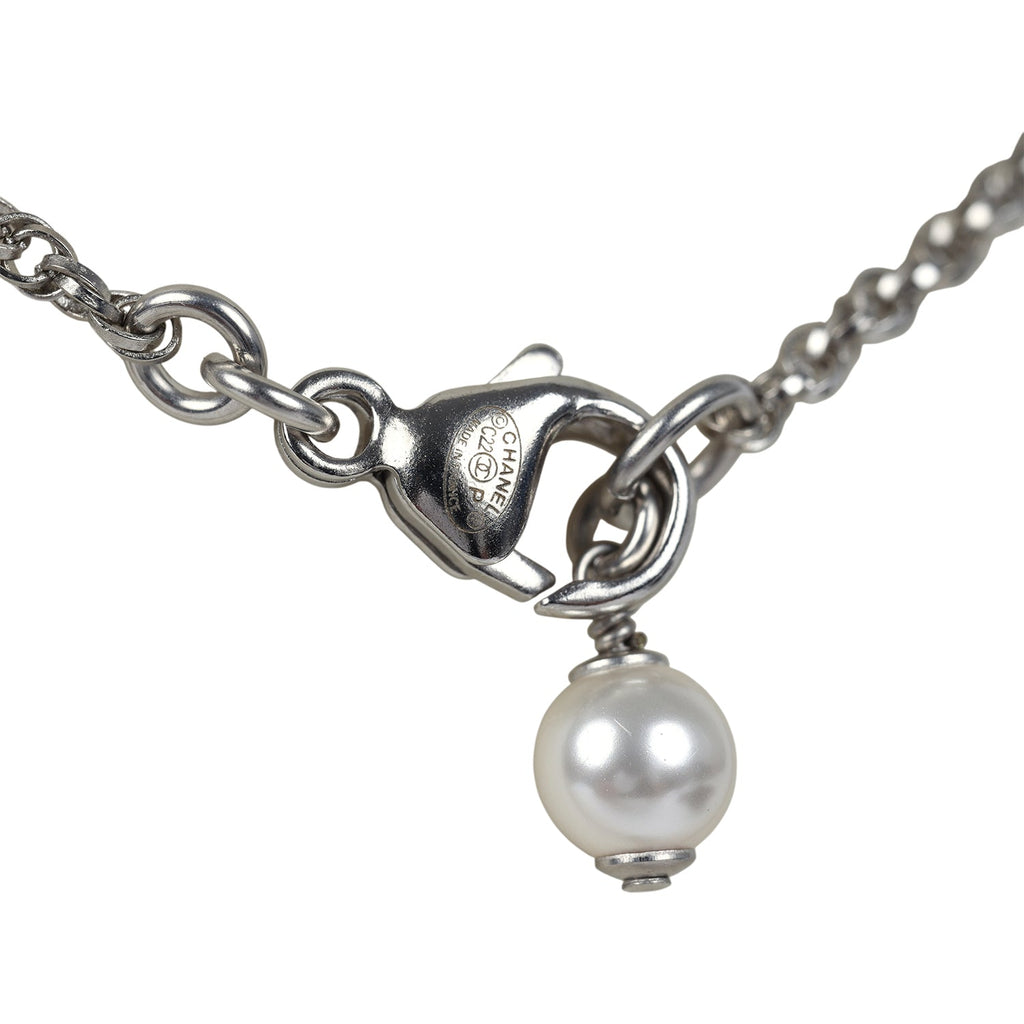 Chanel Faux Pearl and Crystal CC Pendant Necklace Silver Tone Hardware