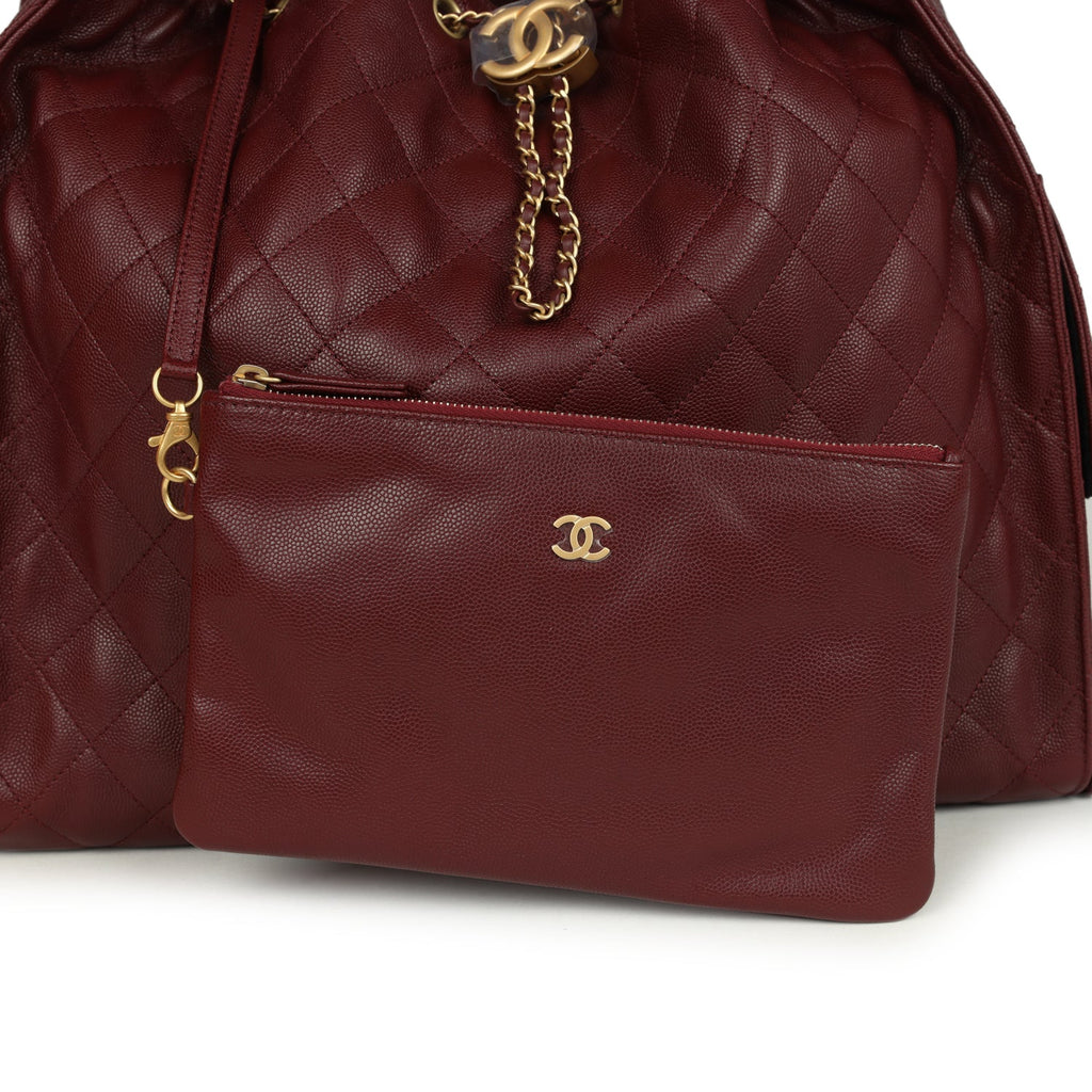 This Chanel Large 25 Hobo Bag is in burgundy caviar leather with antique gold hardware, features signature diamond quilt, two exterior side pockets, drawstring closure, a removable pouch, and a single interwoven antique gold and burgundy leather shoulder strap.