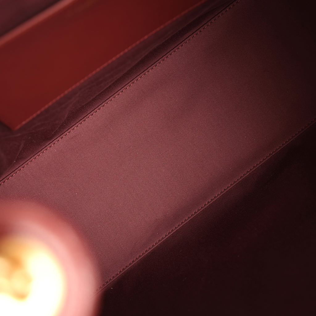 The interior is lined in burgundy grossgrain fabric and has three small slit pockets; one on the rear wall and one slit pocket on each interior side.