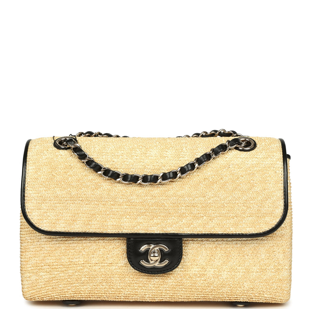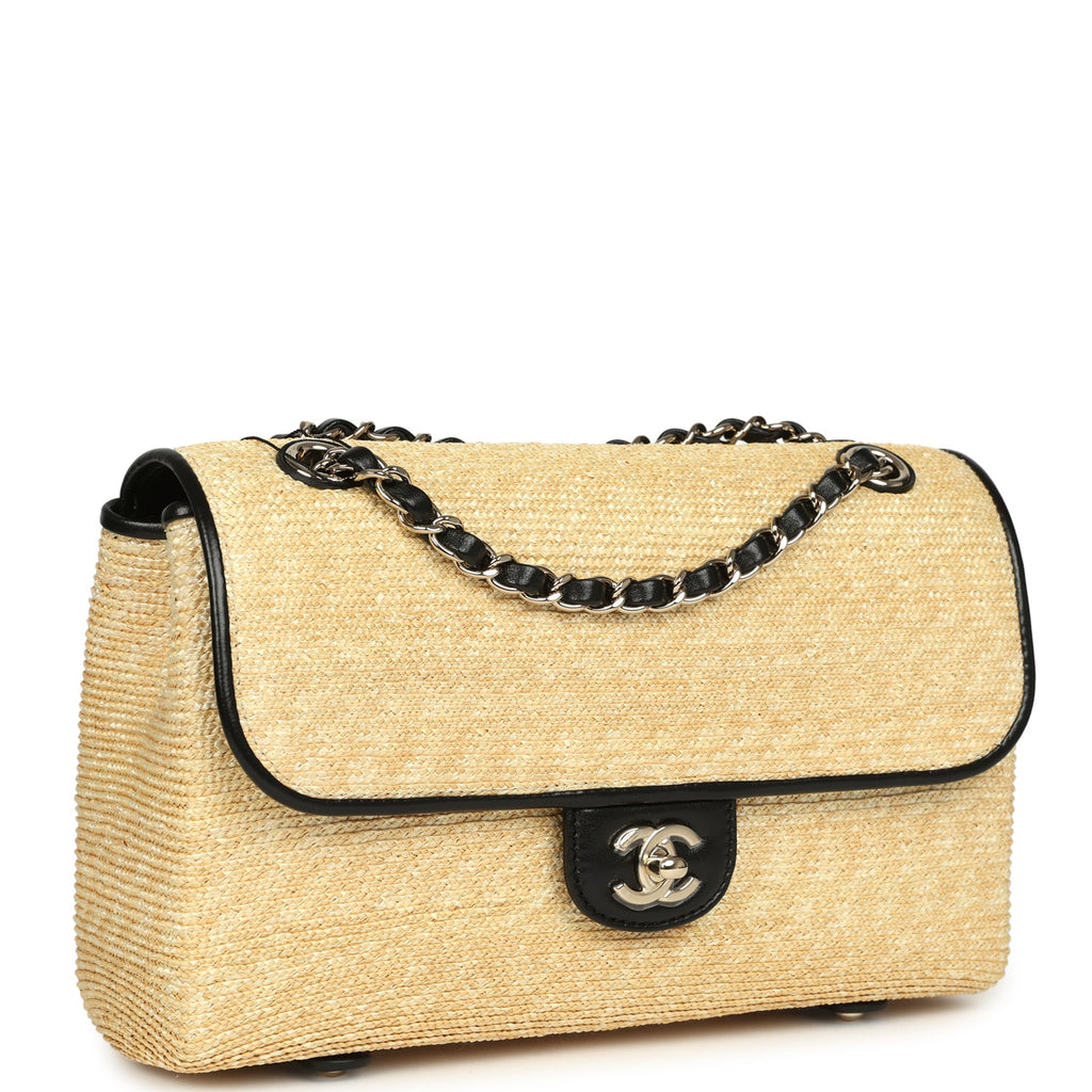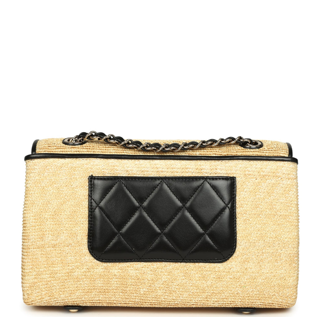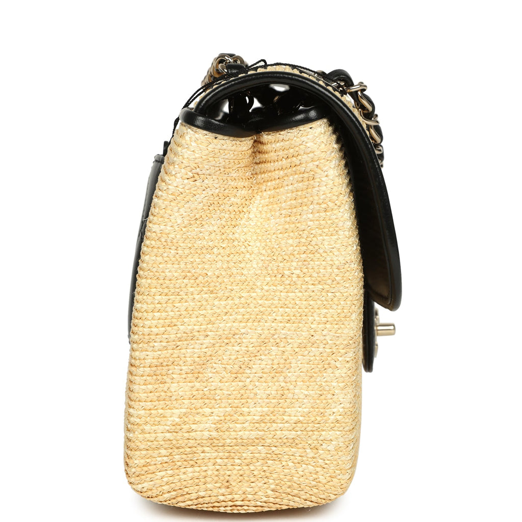Chanel Large Flap Bag Beige Raffia and Black Lambskin Light Gold Hardware