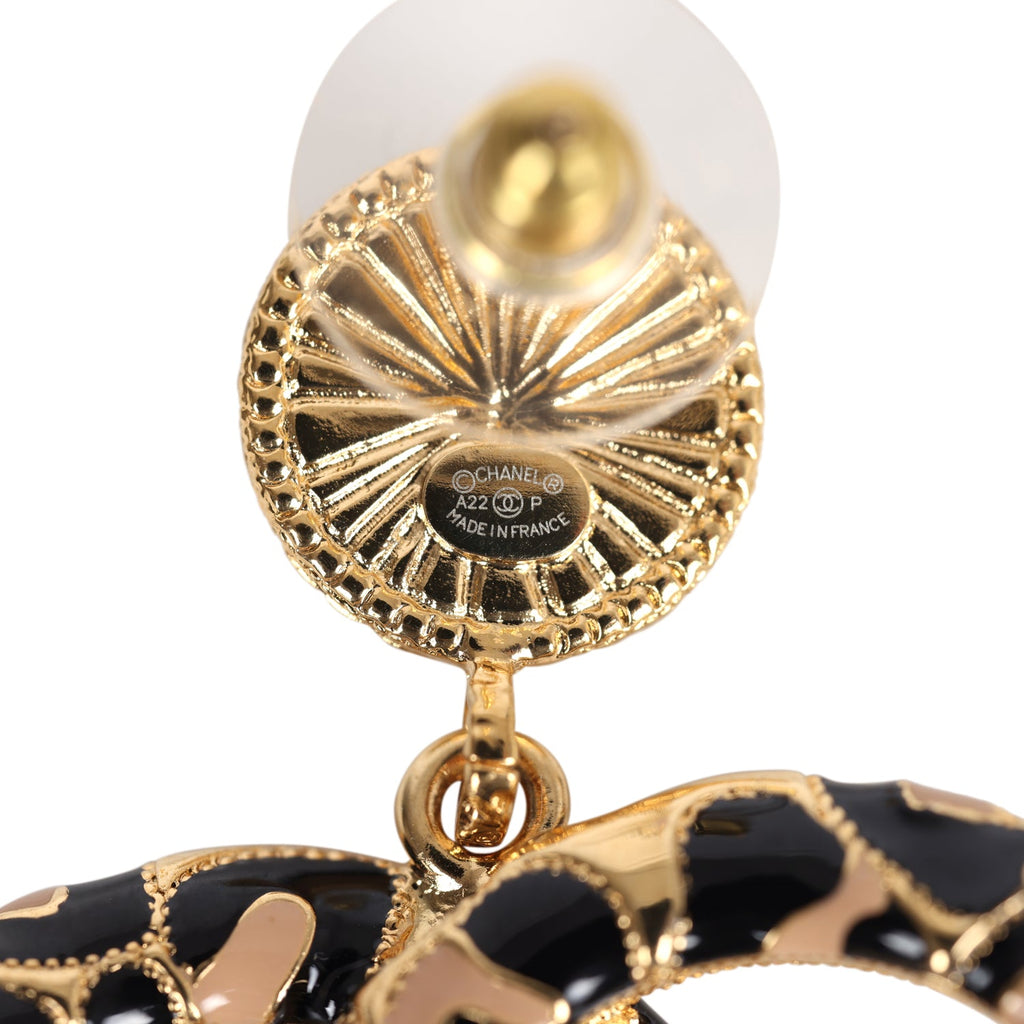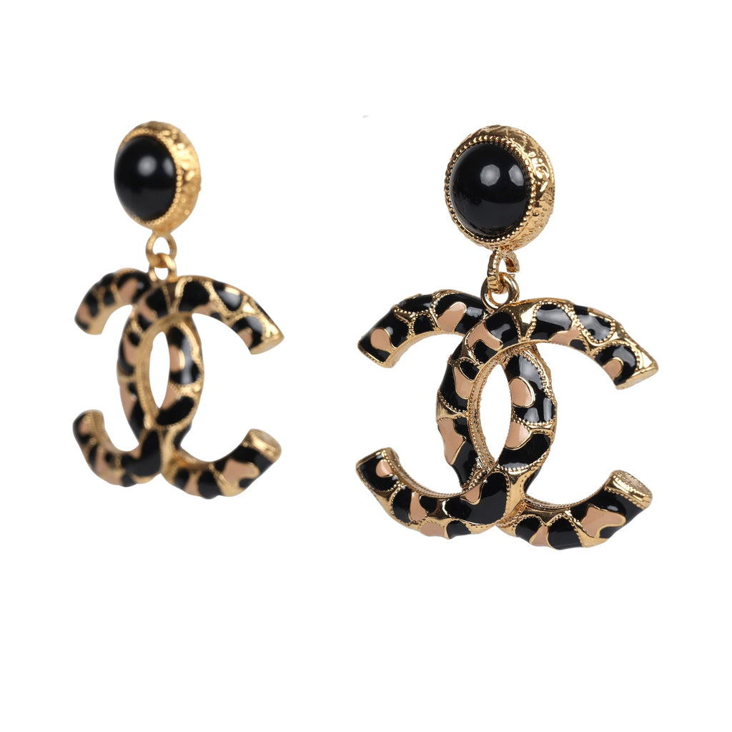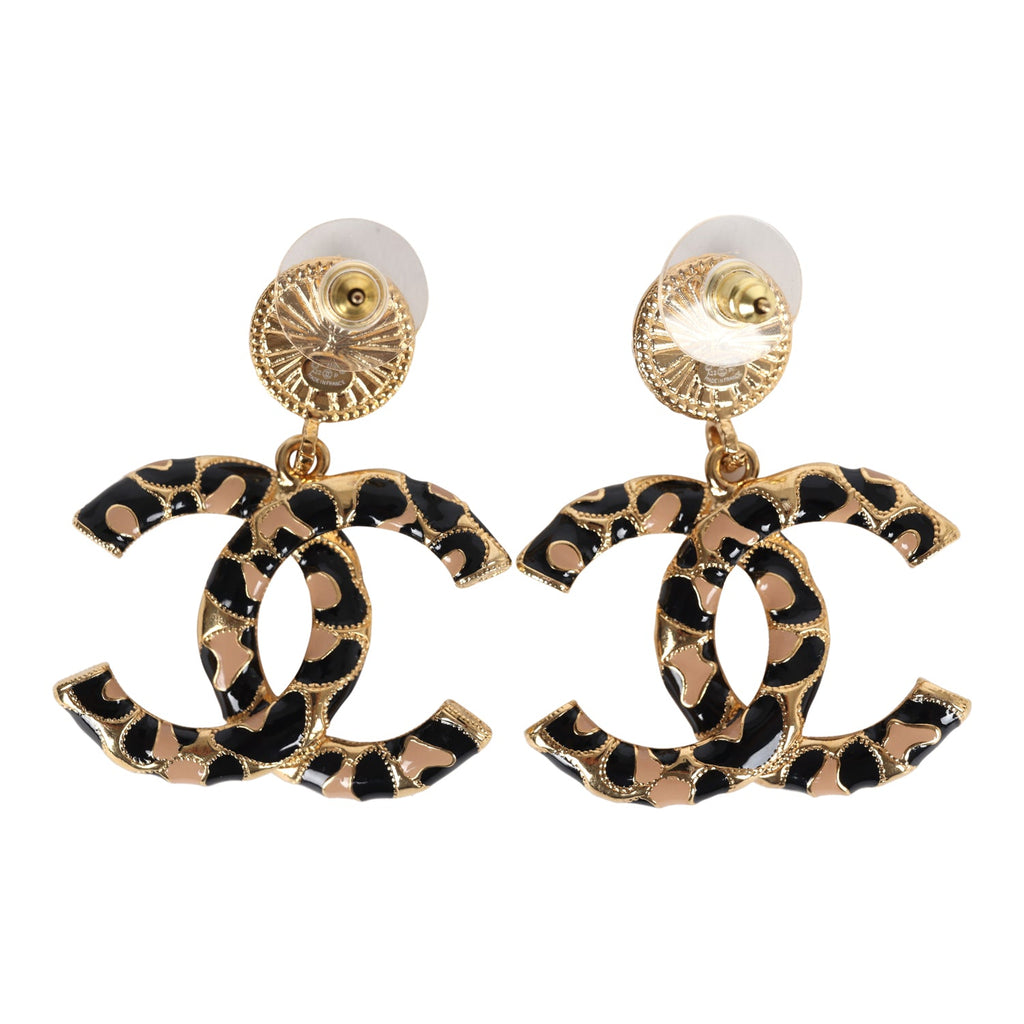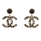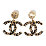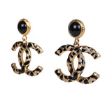 Chanel Large Leopard Print CC Dangle Earrings Black/Brown Enamel Gold Hardware