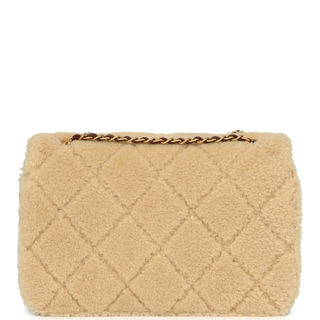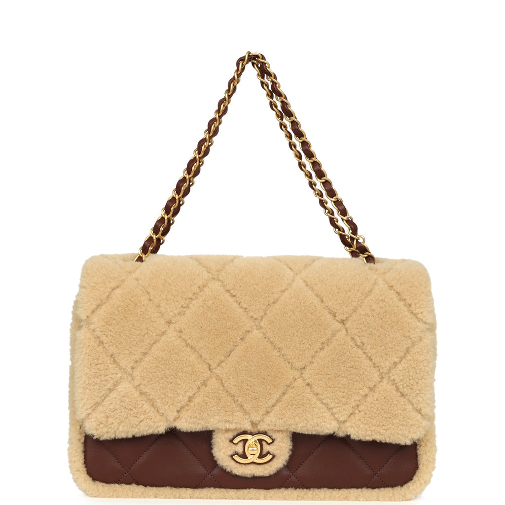 Chanel Large Shearling Flap Bag Dark Brown Lambskin and Beige Shearling Brushed Gold Hardware