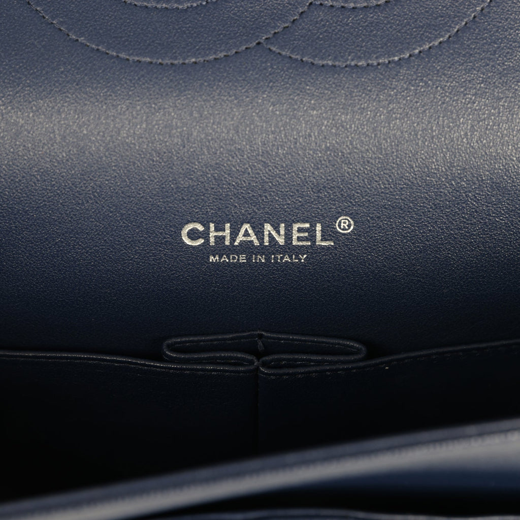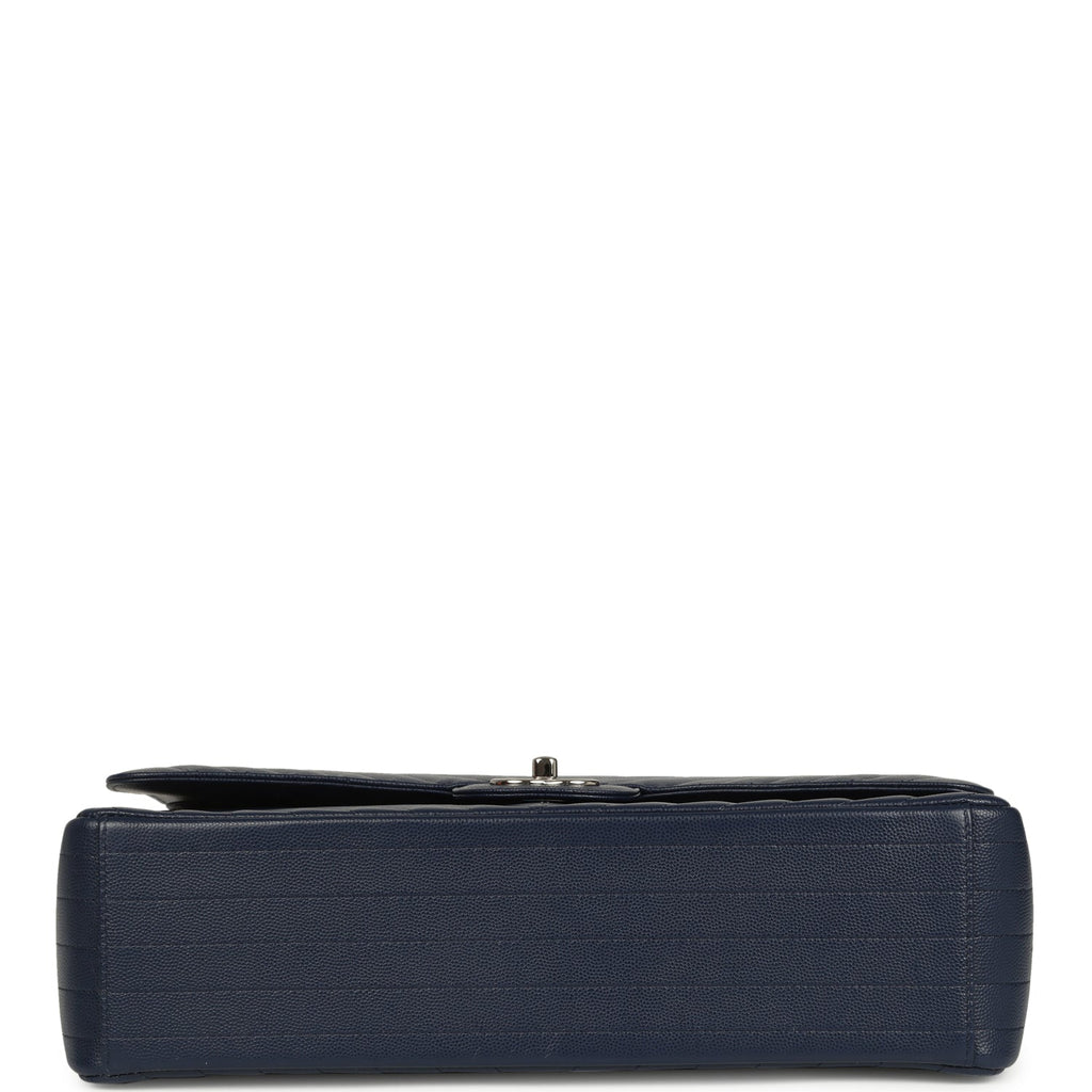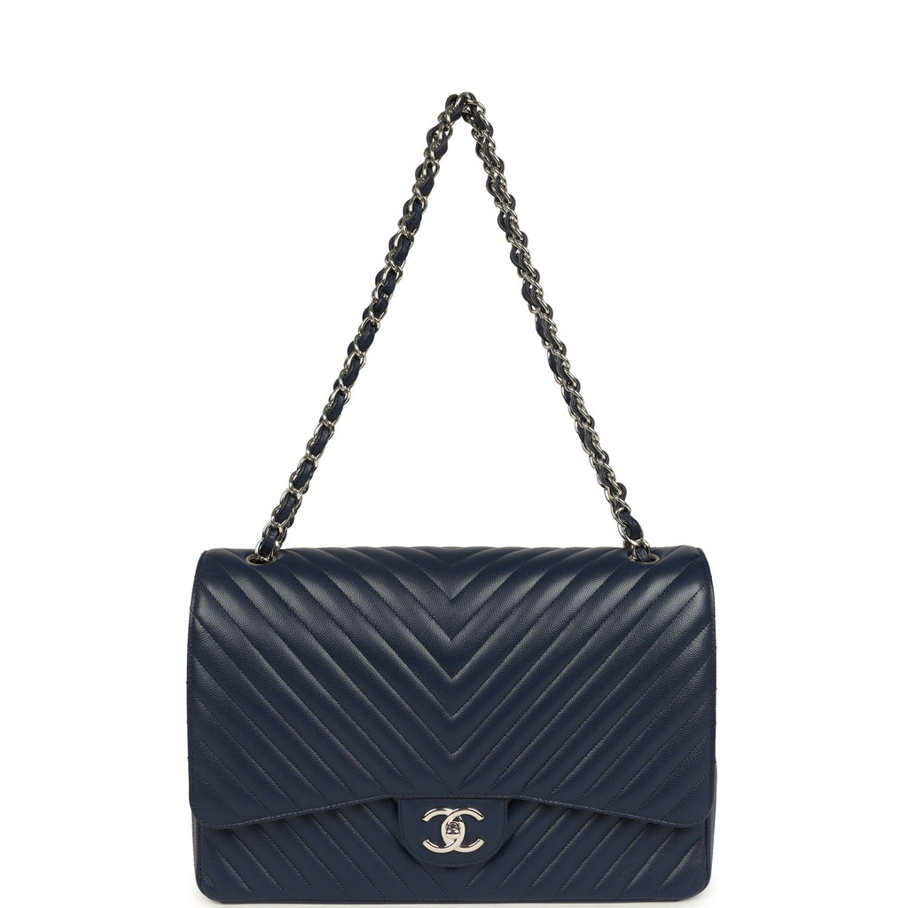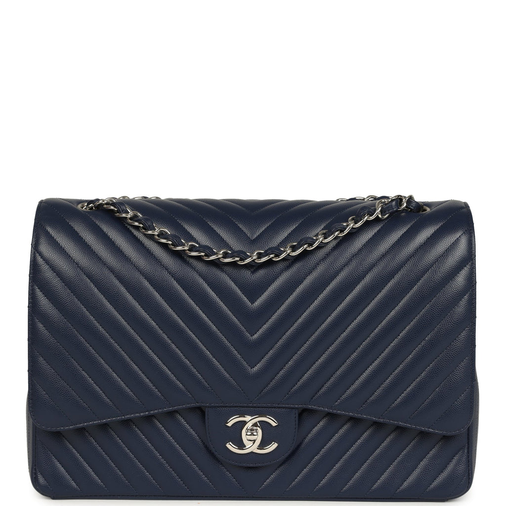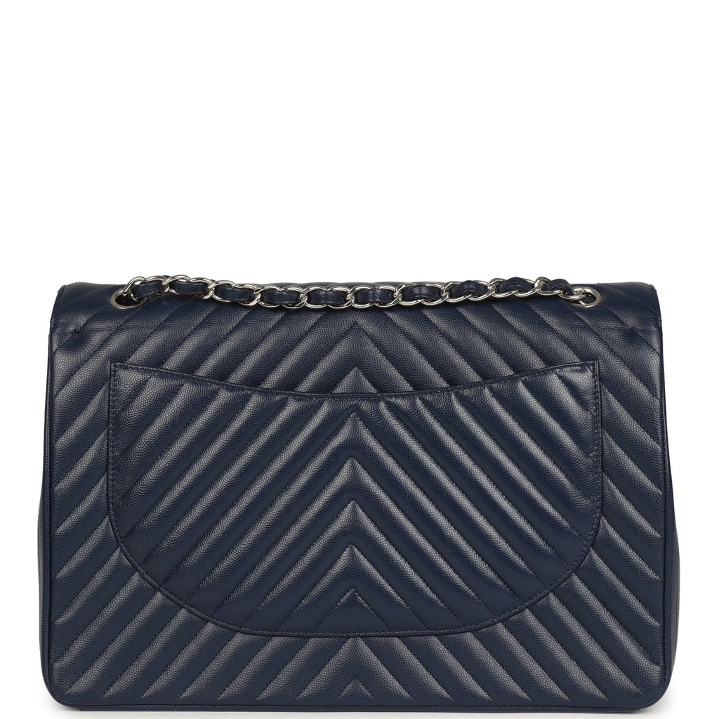 Chanel Maxi Classic Chevron Double Flap Bag Dark Blue Caviar Silver Hardware
