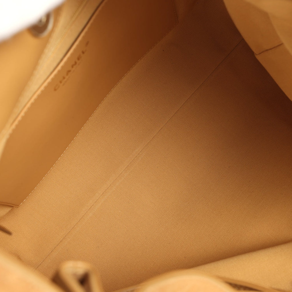 The interior is lined in beige grossgrain fabric and has one zipper pocket with Chanel pull on the rear wall and an open pocket below.