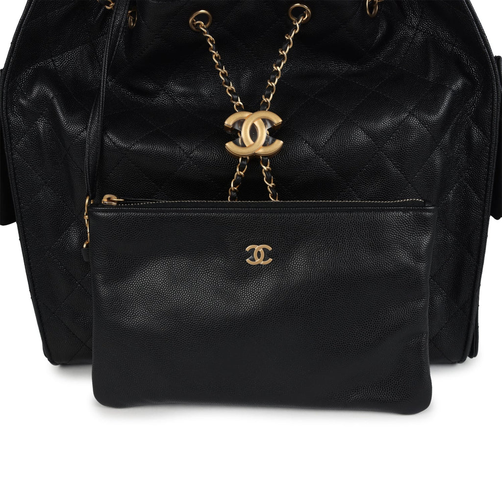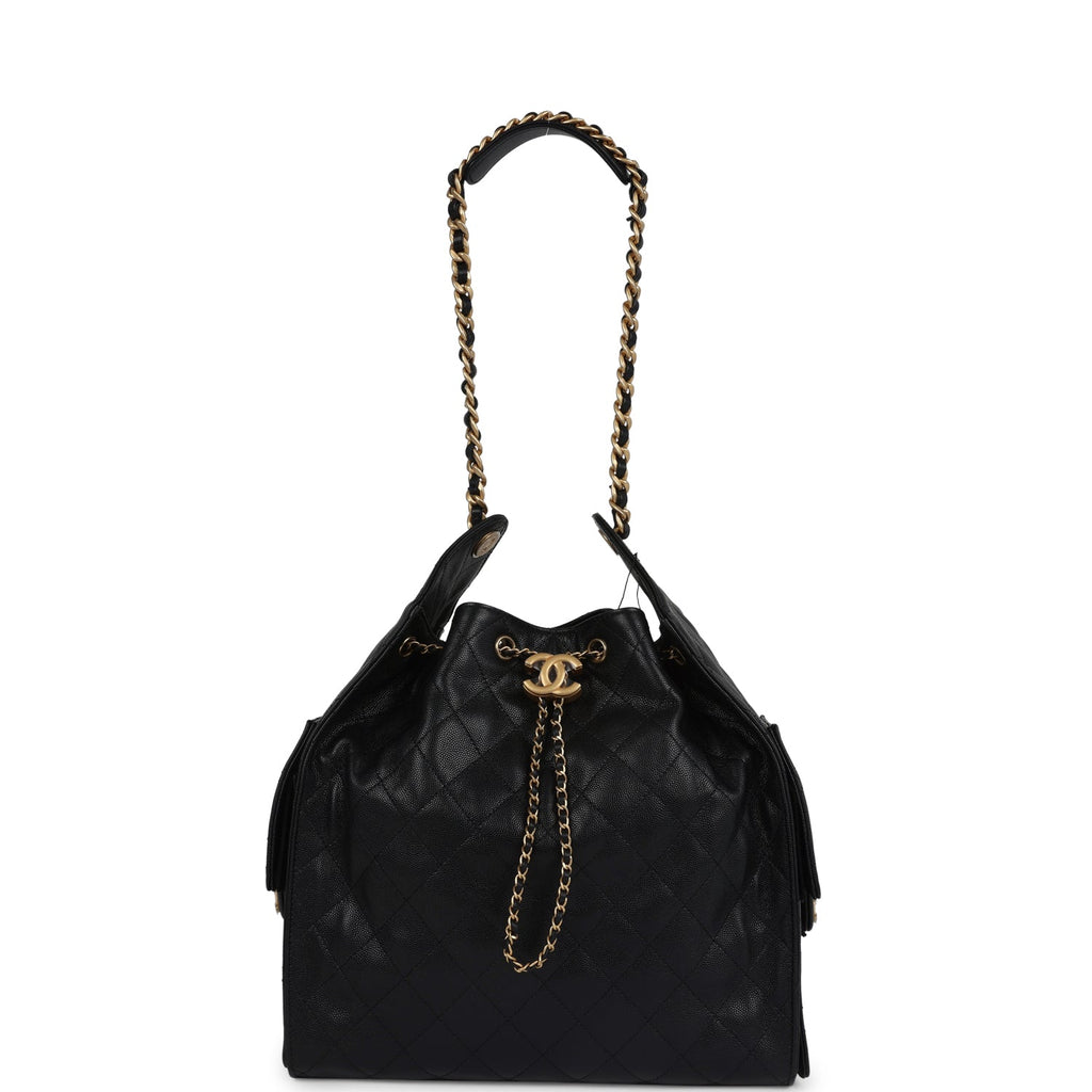 This Chanel Medium 25 Hobo Bag is in black caviar leather with antique gold hardware, features signature diamond quilt, two exterior side pockets, drawstring closure, a removable pouch, and a single interwoven antique gold and Black leather shoulder strap.