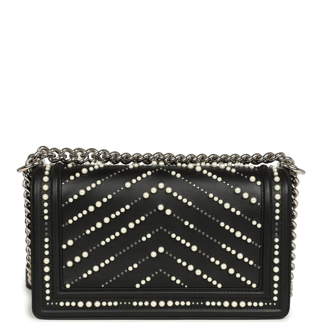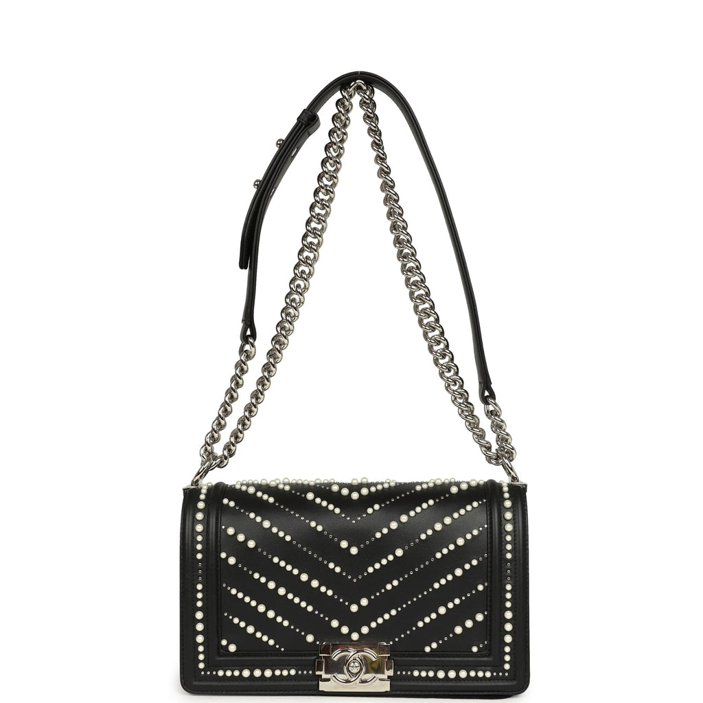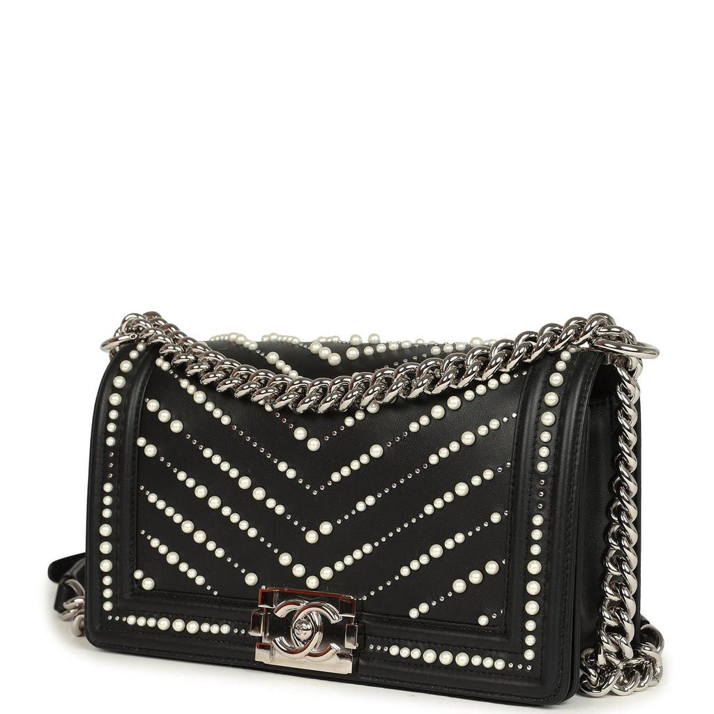 Chanel Medium Boy Bag Black Pearl Chevron Calfskin Silver Hardware