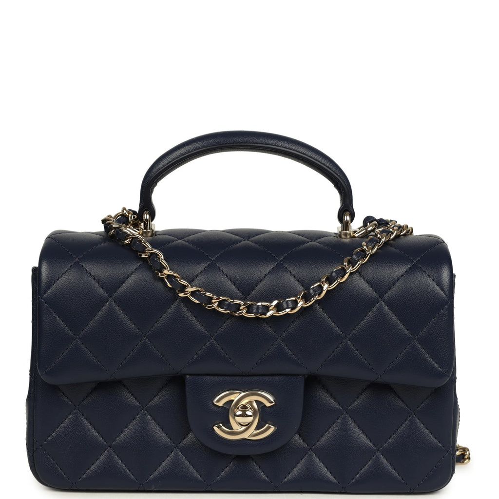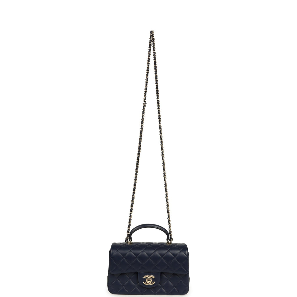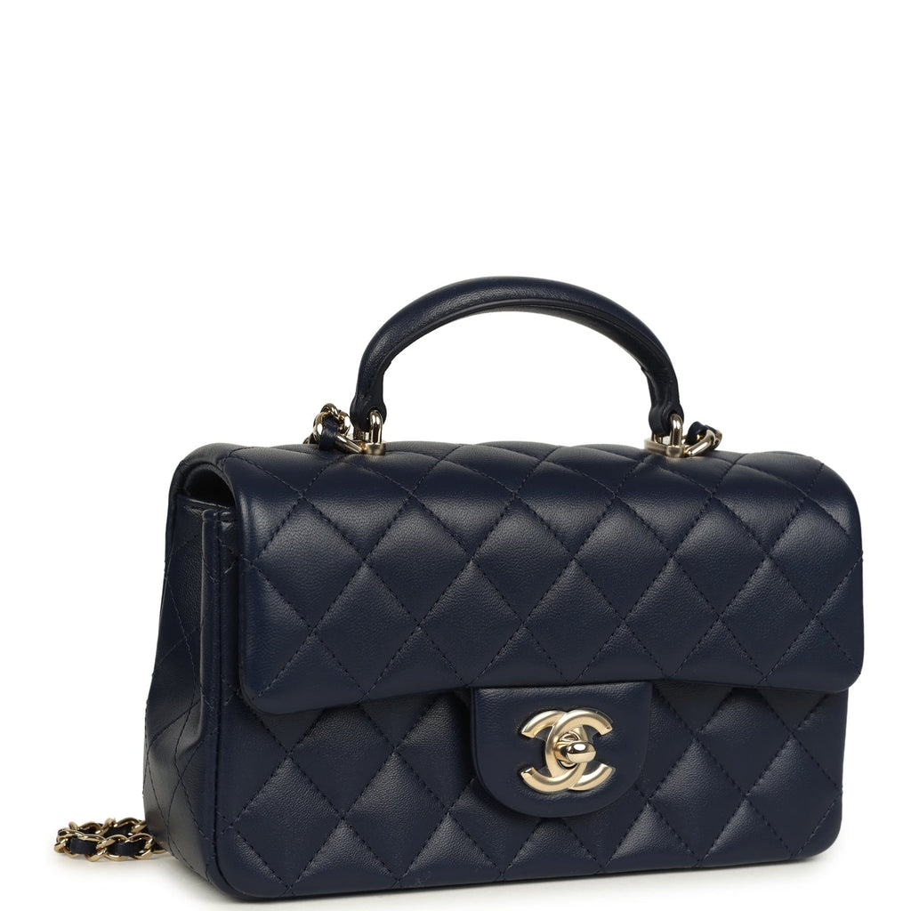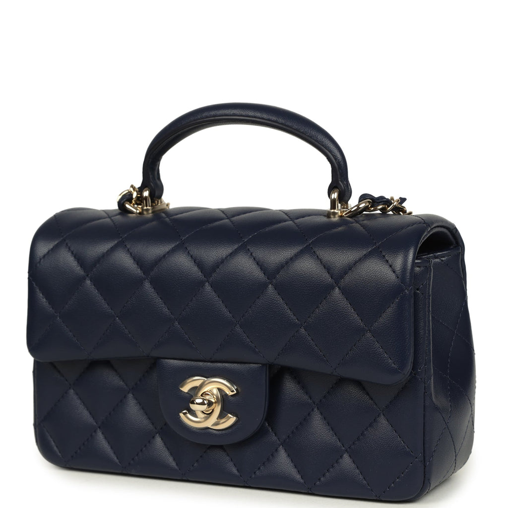 Chanel Mini Classic Rectangular Top Handle Flap Navy Lambskin Light Gold Hardware