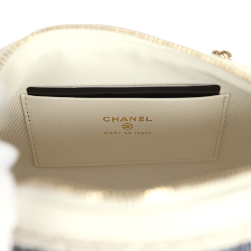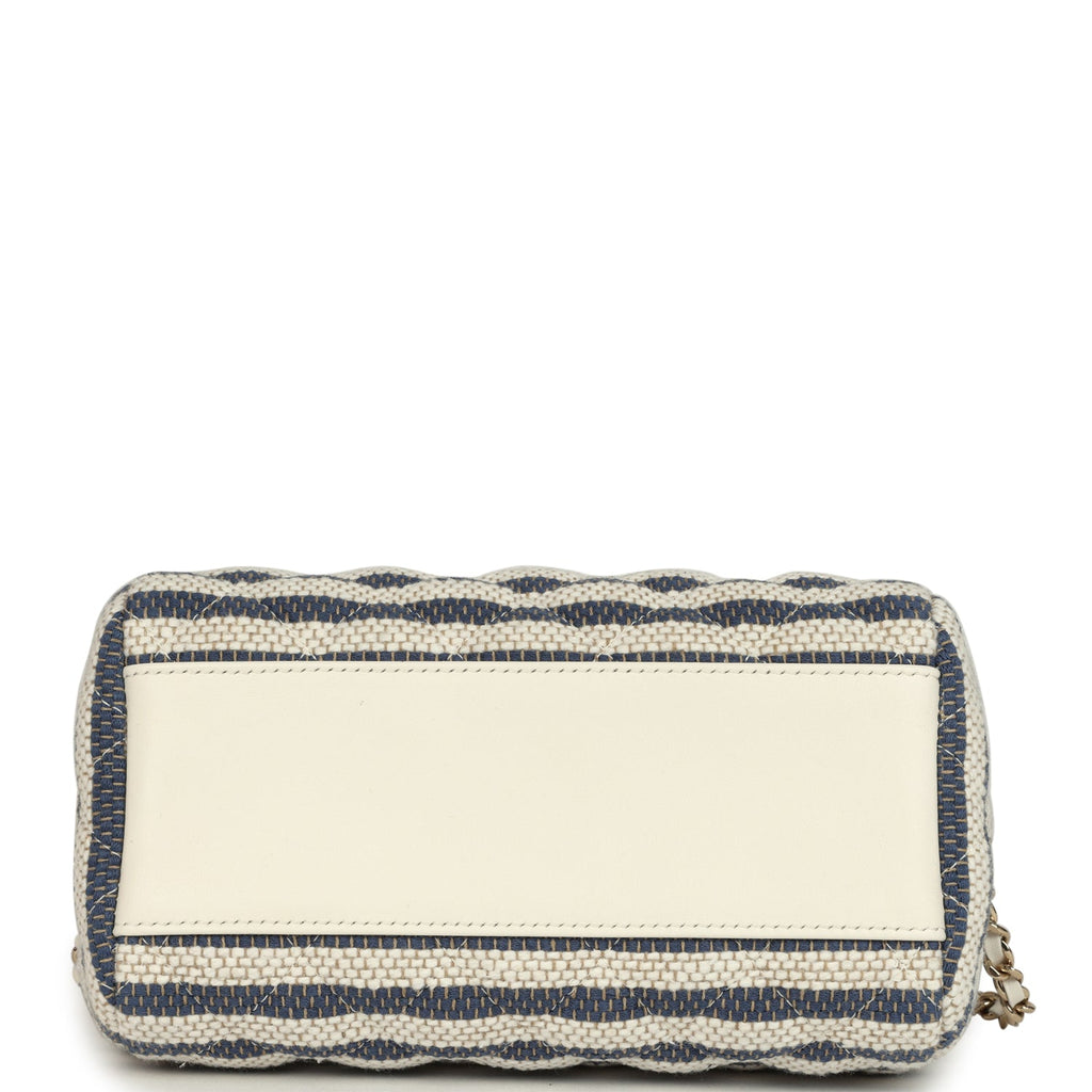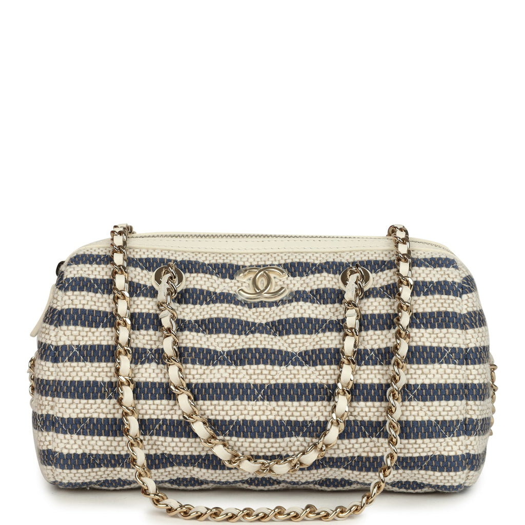 Chanel Mini Timeless Classic Barrel Bag with Chain Light Beige and Dark Blue Striped Woven Fabric Light Gold Hardware