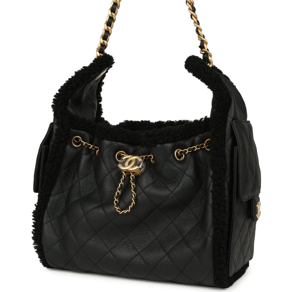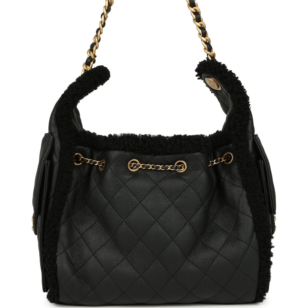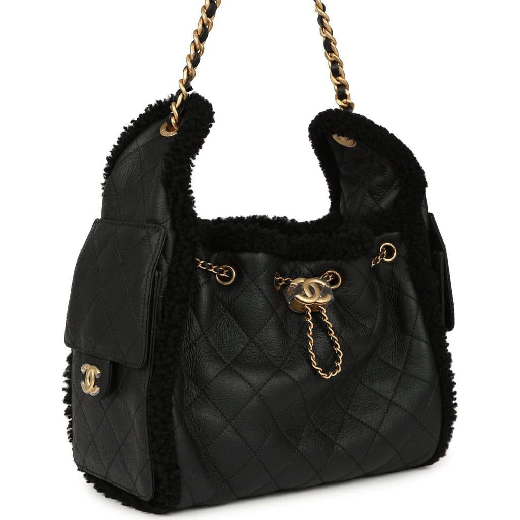 Chanel Small 25 Hobo Bag Black Crumpled Sheepskin and Shearling Antique Gold Hardware