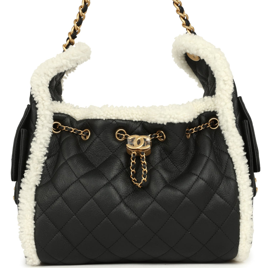Chanel Small 25 Hobo Bag Black Crumpled Sheepskin and White Shearling Antique Gold Hardware
