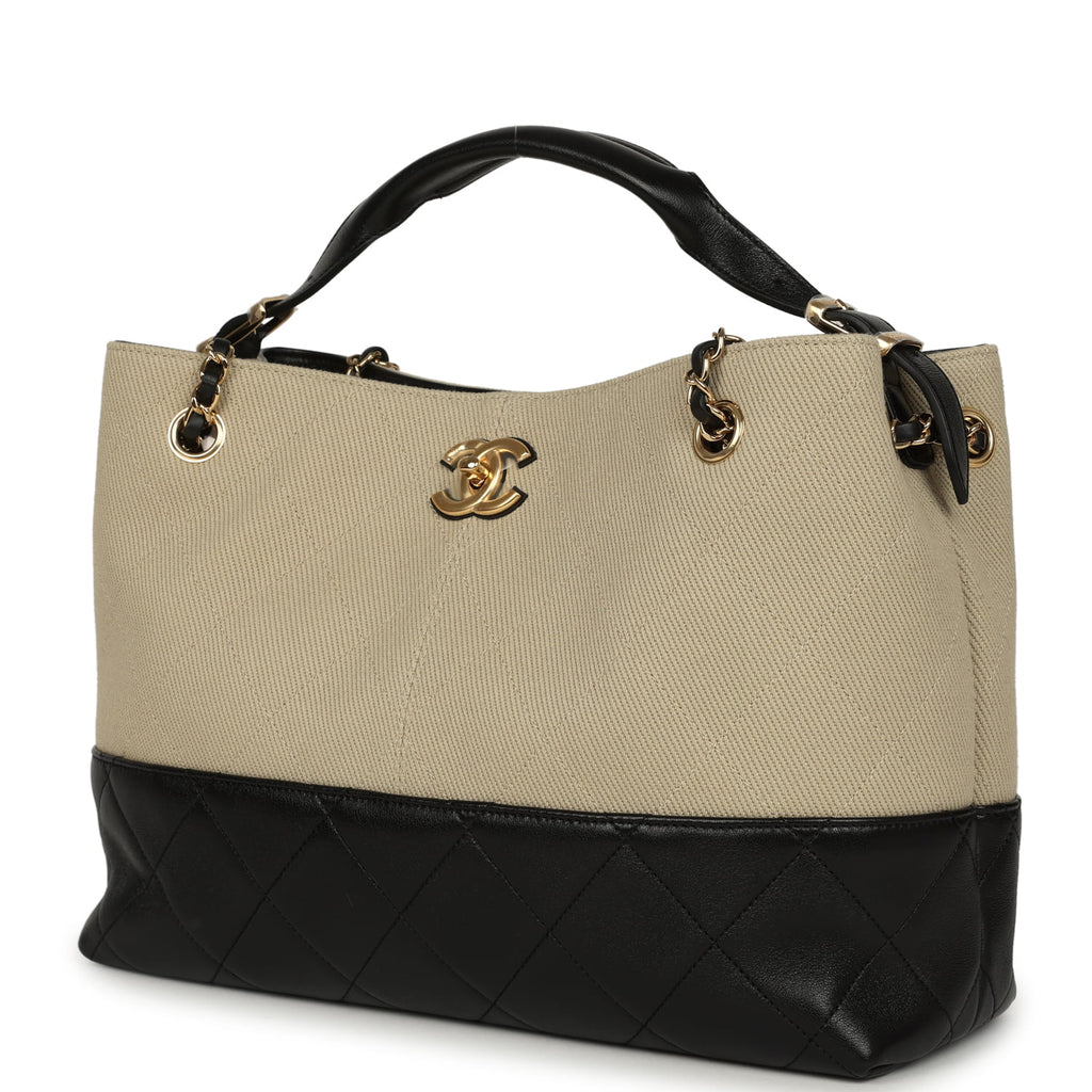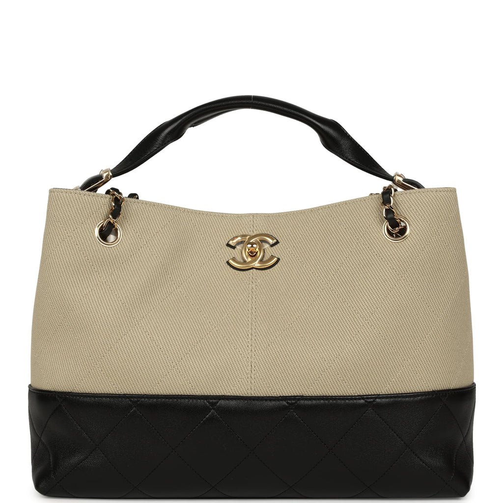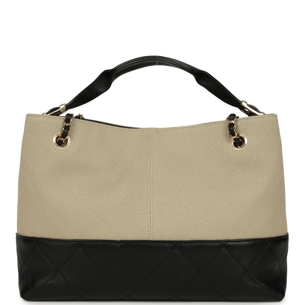 Chanel Small Coco Base Hobo Bag Beige Canvas and Black Shiny Lambskin Gold Hardware