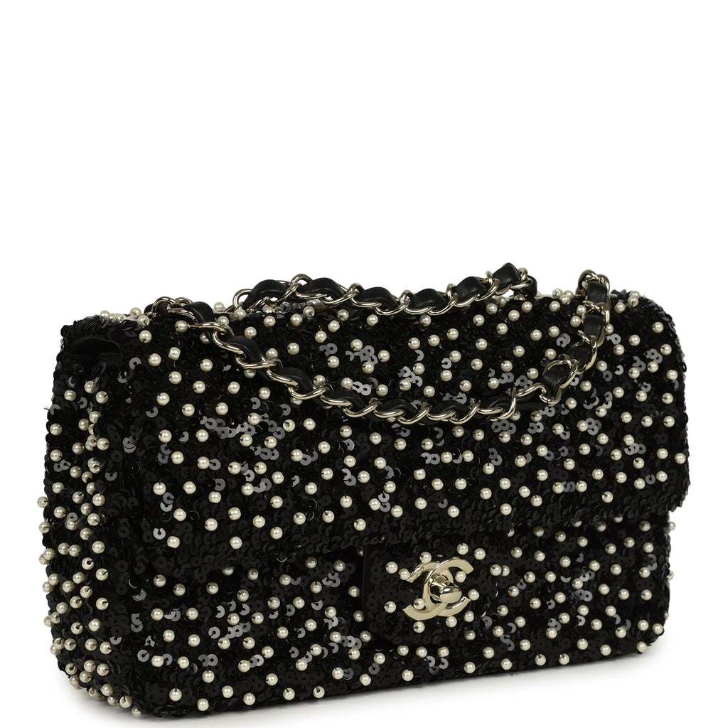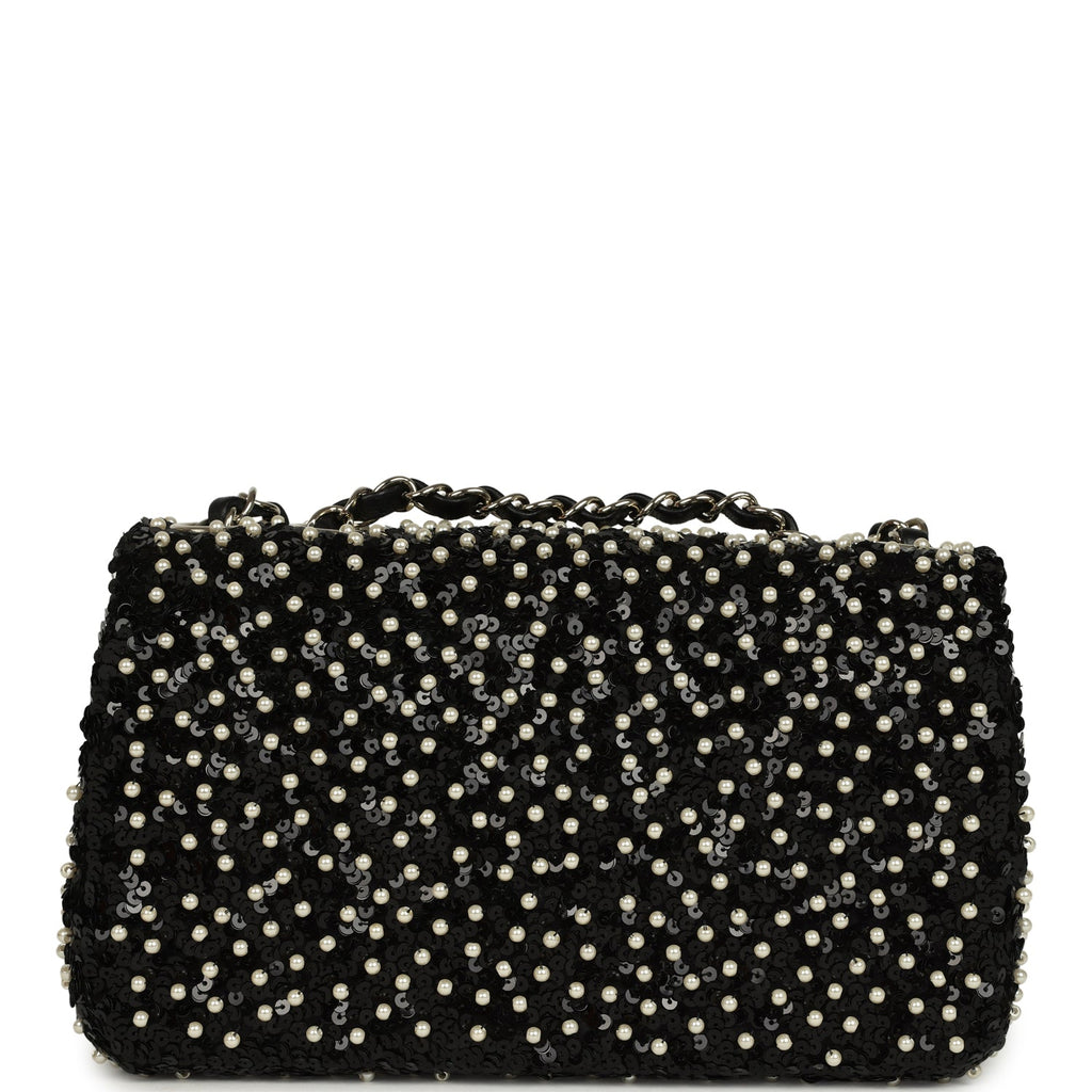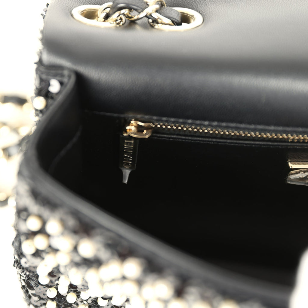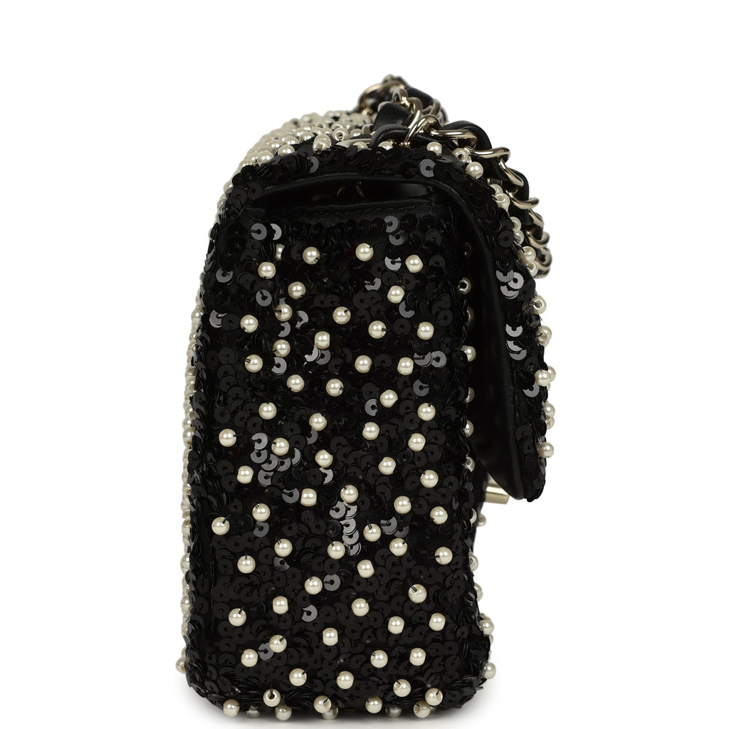 Chanel Small Pearl Beaded Flap Bag Black and White Sequins Light Gold Hardware