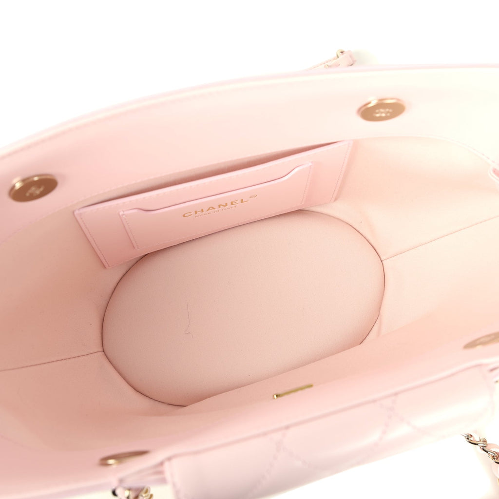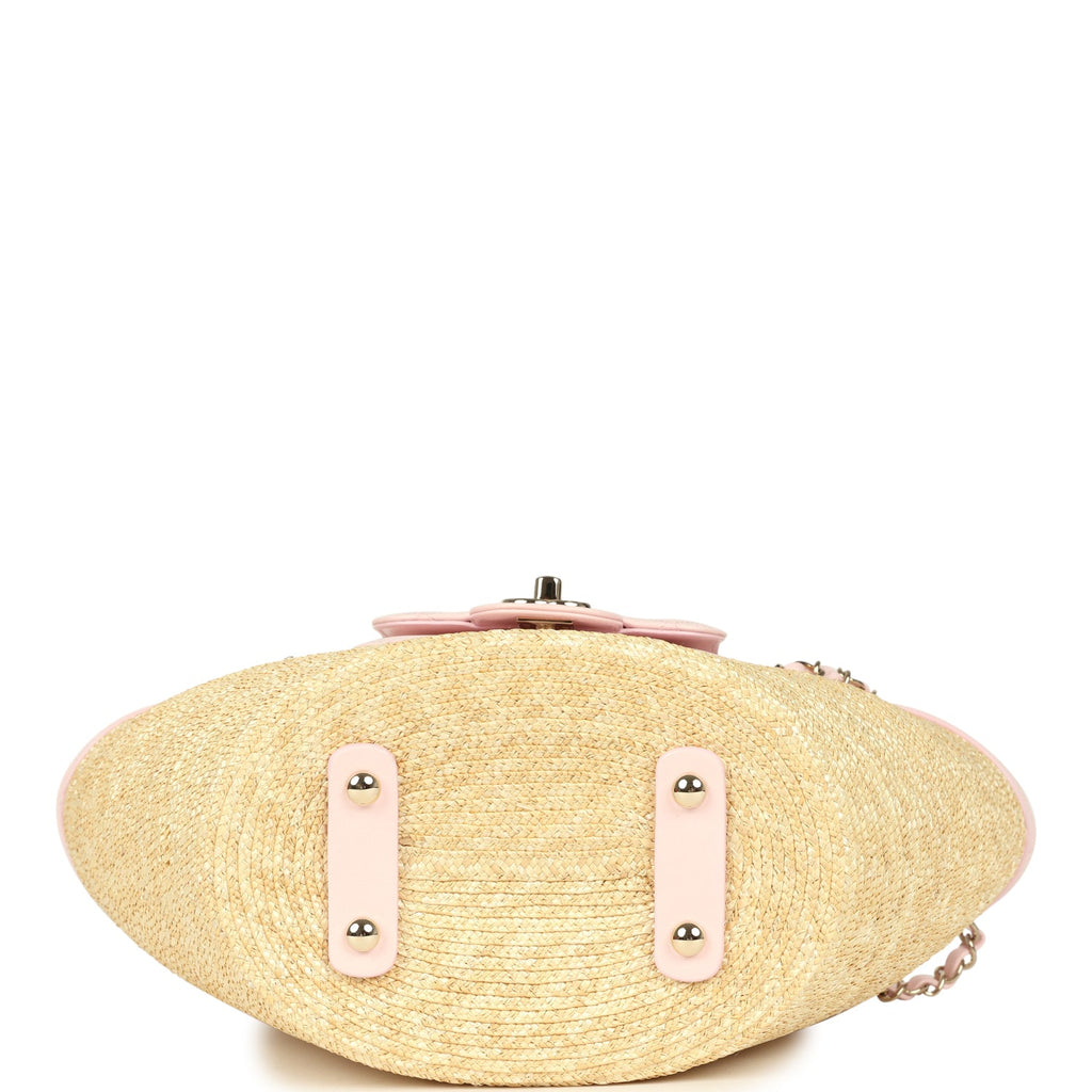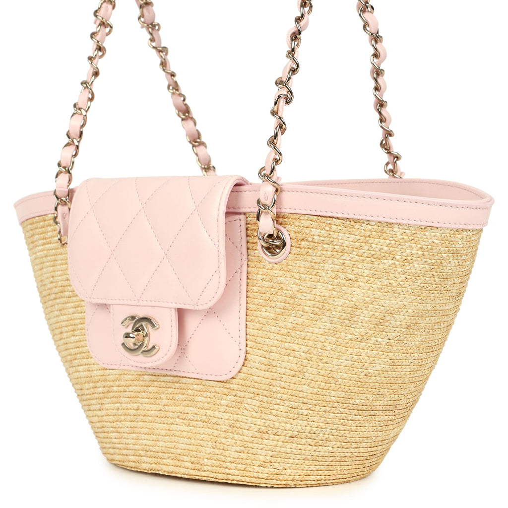 Chanel Small Shopping Tote Bag Beige Raffia and Light Pink Lambskin Light Gold Hardware