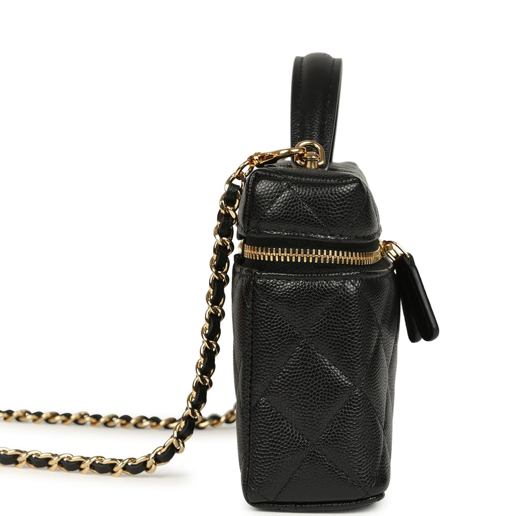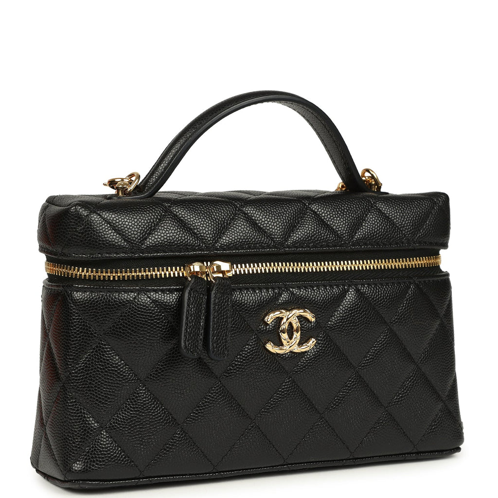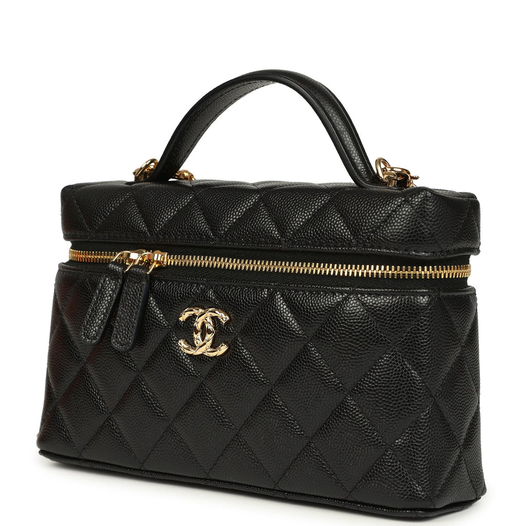 Chanel Top Handle Long Vanity Case with Chain Black Shiny Caviar Gold Hardware
