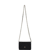 This Chanel Classic Quilted Wallet on Chain is in black caviar leather with gold tone hardware and has a front flap with CC snap closure, half moon back pocket, and a gold tone metal and black leather interwoven chain.