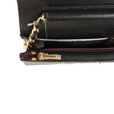 The interior is lined in burgundy leather and fabric and features a top zipper pocket under flap, a slit front pocket, a zipper compartment with leather pull, and an open pocket with six credit card slots.