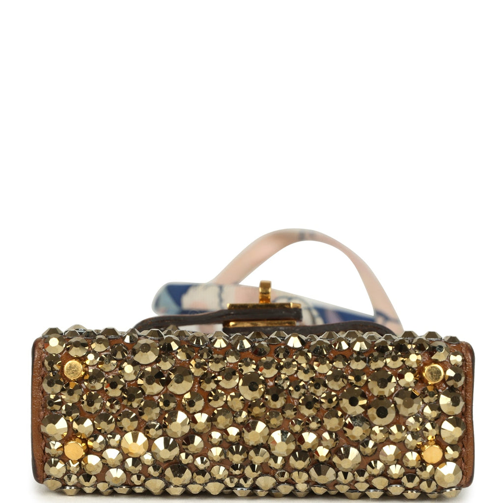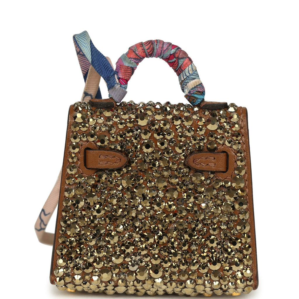 Custom Brown Swarovski Crystal Hermes Mini Kelly Twilly Bag Charm Alezan Tadelakt Gold Hardware