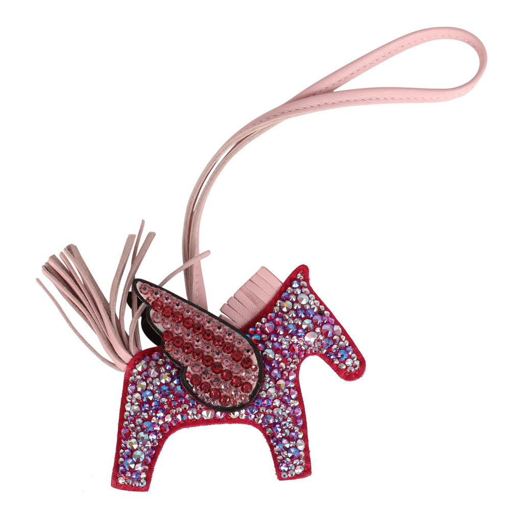 Custom Pink Swarovski Crystal Hermes Bedazzled Pegasus Rodeo Bag Charm PM Framboise, Rose Sakura and Rouge Sellier Milo Lambskin