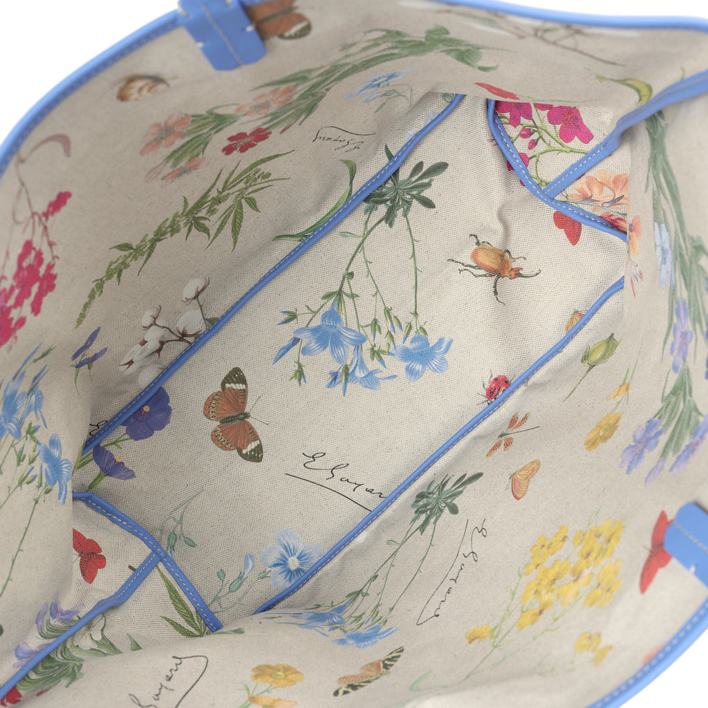 This 2025 limited edition Goyard Saint Louis PM tote is in Iris Goyardine coated canvas and Chevroches Calfskin leather with palladium hardware, contrast stitching, two flat top handles, and has a matching detachable button closure wallet. This is a reversible tote to showcase the floral print interior.