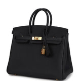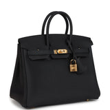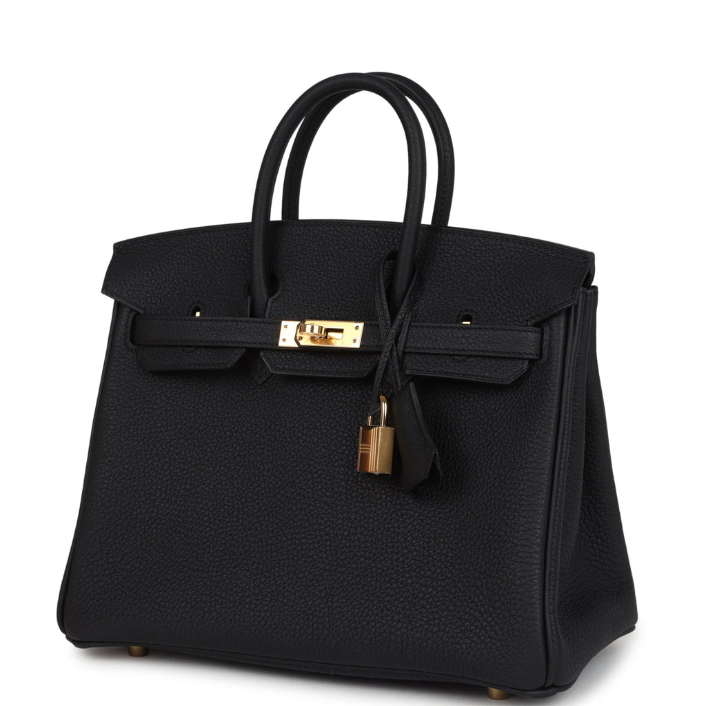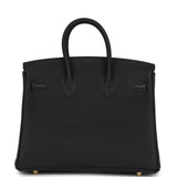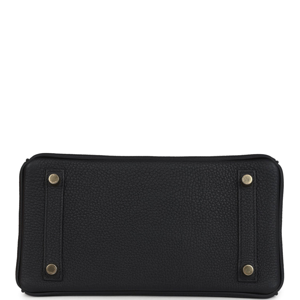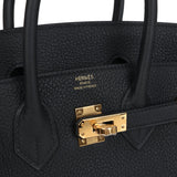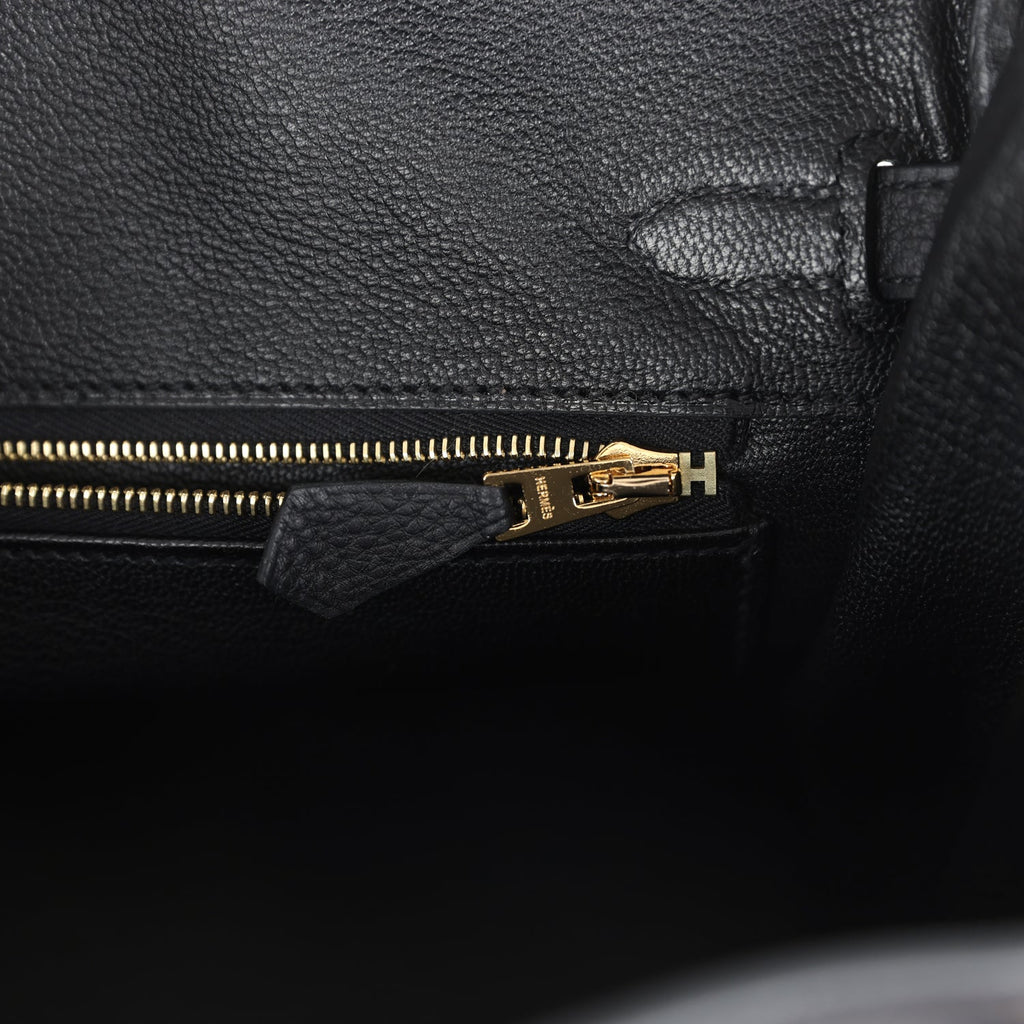 This Birkin is in Black togo leather with gold hardware, has tonal stitching, front flap, two straps with center toggle closure, clochette with lock and two keys, and double rolled handles.