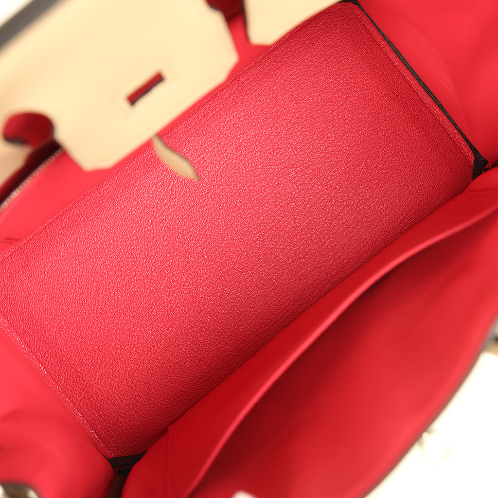 The interior is lined with Bougainvillea chevre and has one zip pocket with an Hermès engraved zipper pull and an open pocket on the opposite side.