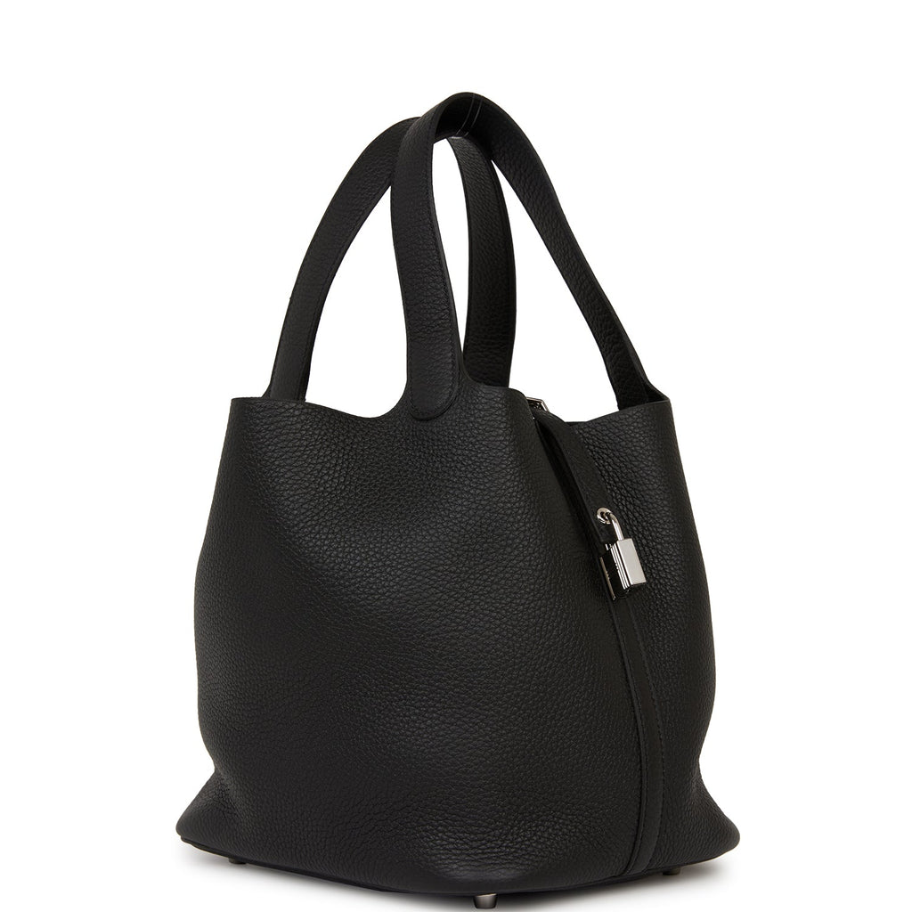 This Picotin is in black clemence leather with palladium hardware and has tonal stitching with two top handles.