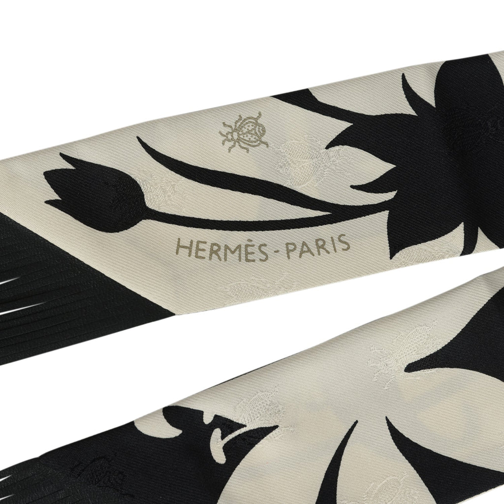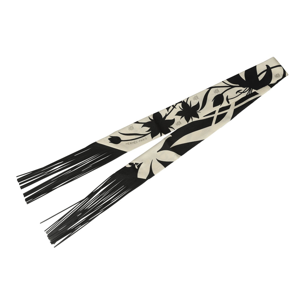 Hermes "Bouquet Final" Cream and Black Fringe Silk Twilly