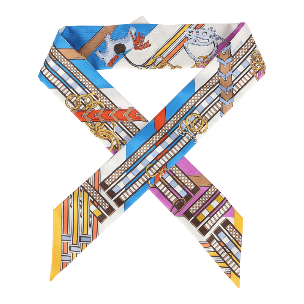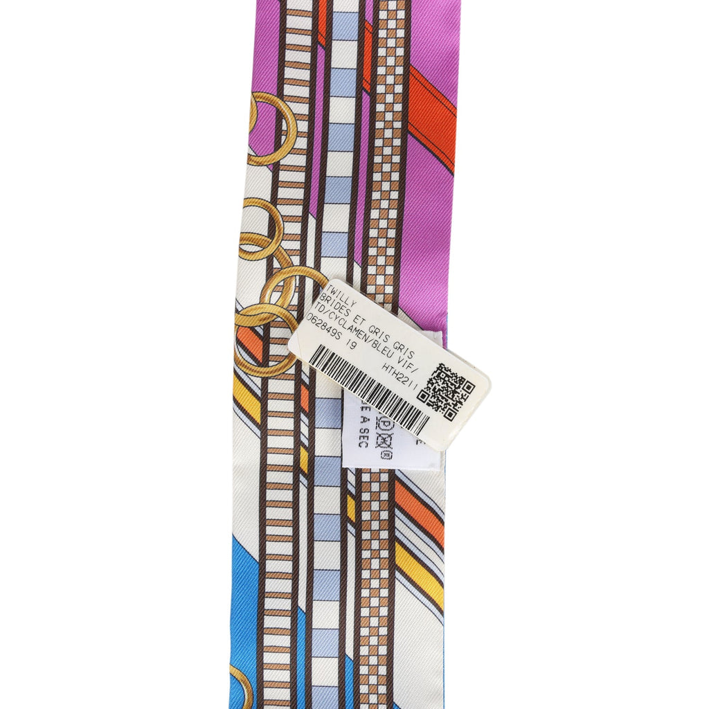 This Hermes "Brides Et Gris" silk Twilly pair is in Cyclamen, Bleu Vif and Gris, designed by Virginie Jamin in a multi colorway.