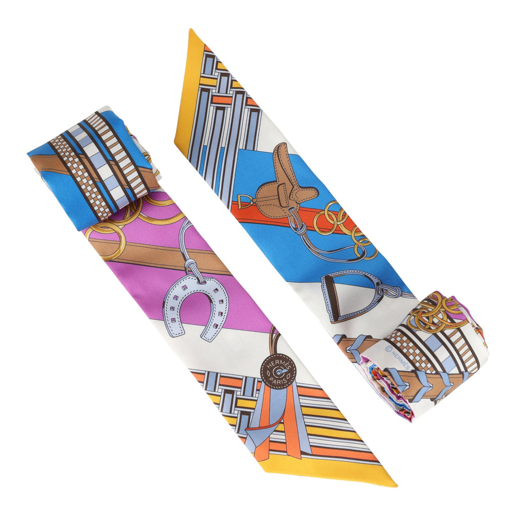Hermes "Brides Et Gris" Cyclamen Multi Silk Twilly Pair