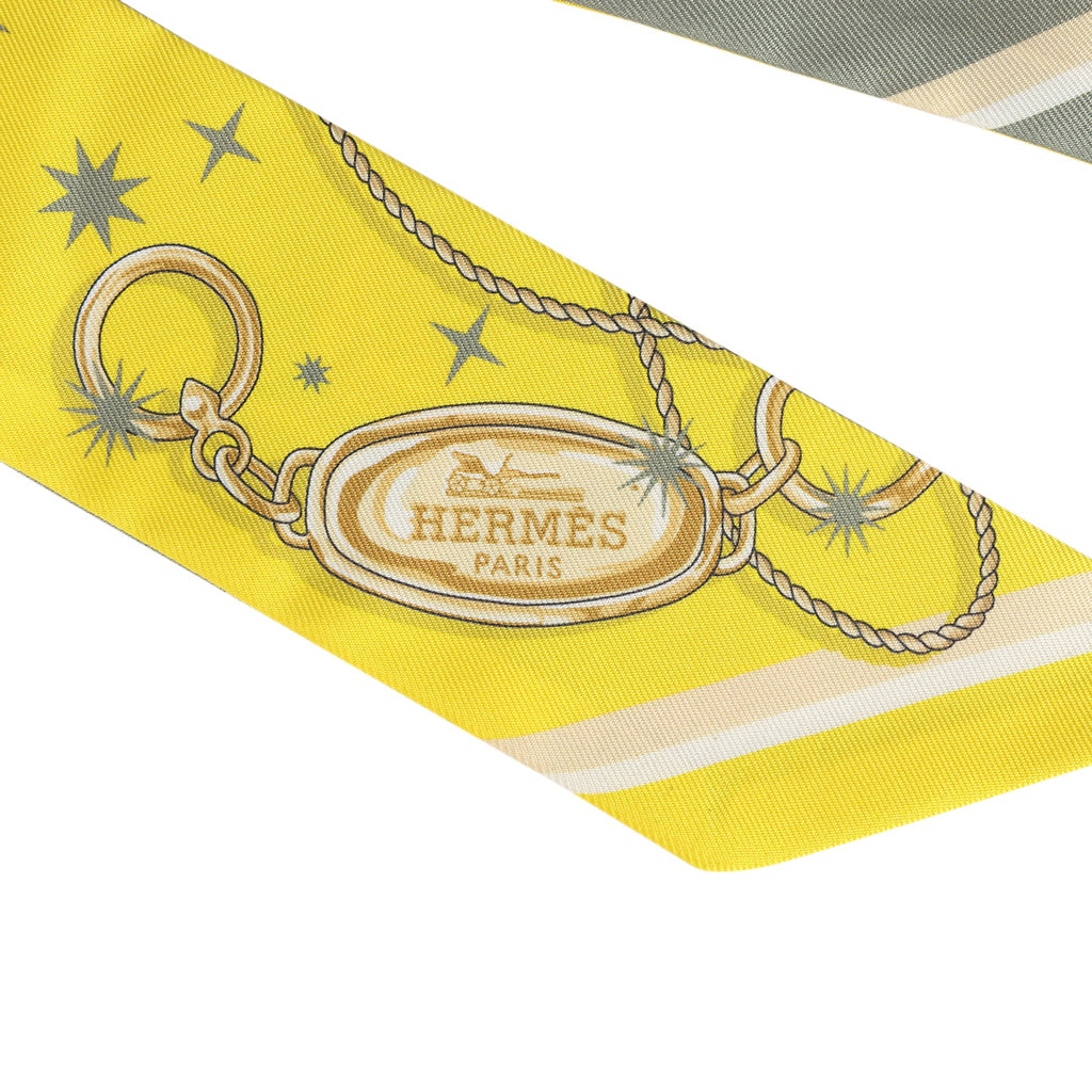 Hermes "C'est La Fete" Jaune Vif, Vert, Gris Multi Silk Twilly Pair