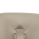 This Hermes Evelyne III PM messenger bag is of Beton clemence leather with palladium hardware, tonal stitching, large perforated H in circle (front), pull tab top snap closure and removable Beton shoulder/crossbody strap.