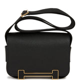 This Geta is in Black chevre leather with gold hardware and has tonal stitching, magnetic flap closure and adjustable shoulder strap.