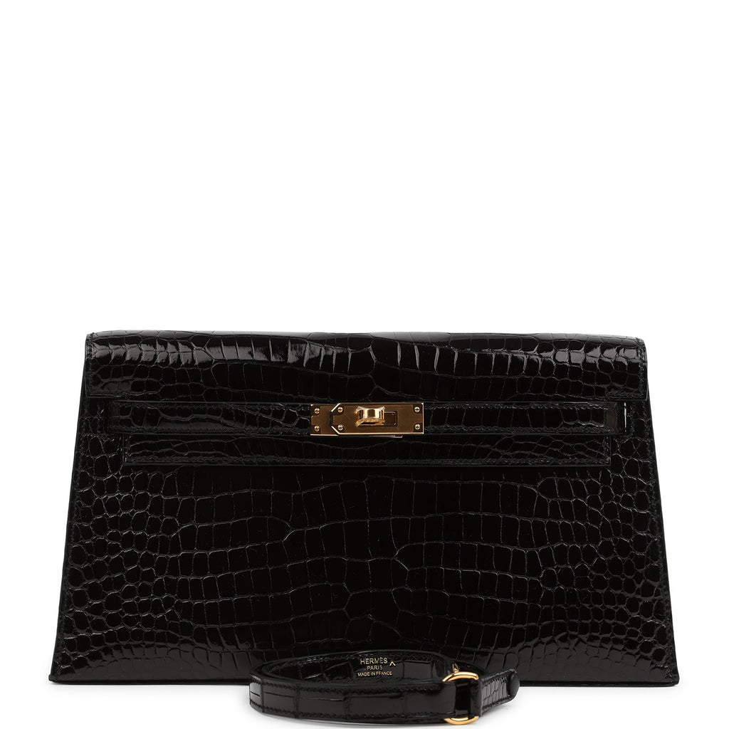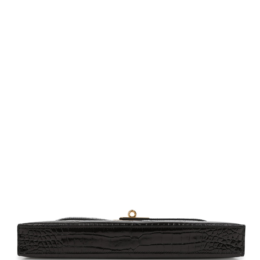 Hermes Kelly Elan Black Shiny Porosus Crocodile Gold Hardware