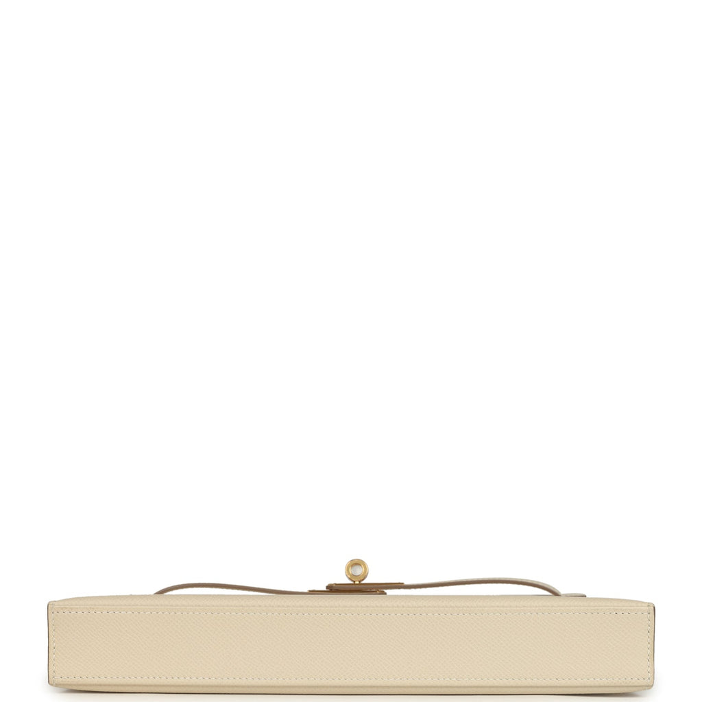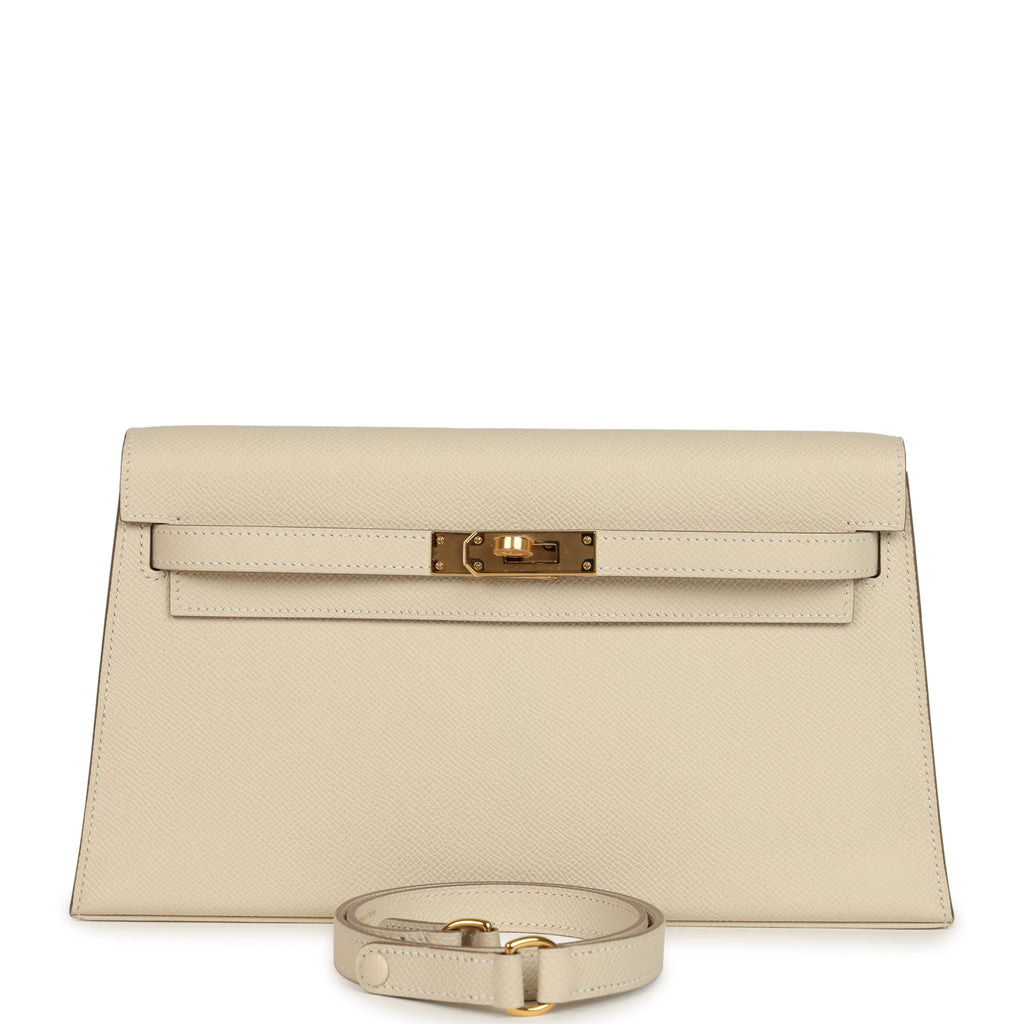 This Kelly Elan is in Craie epsom leather with gold hardware, tonal stitching, two pull straps that attach to a toggle, and an interior that has snaps for detachable shoulder strap.