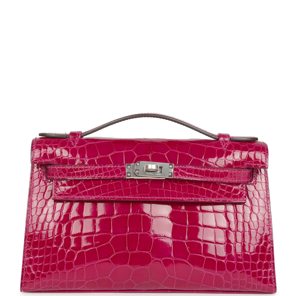 Hermes Kelly Pochette Rose Pourpre Shiny Alligator Palladium Hardware