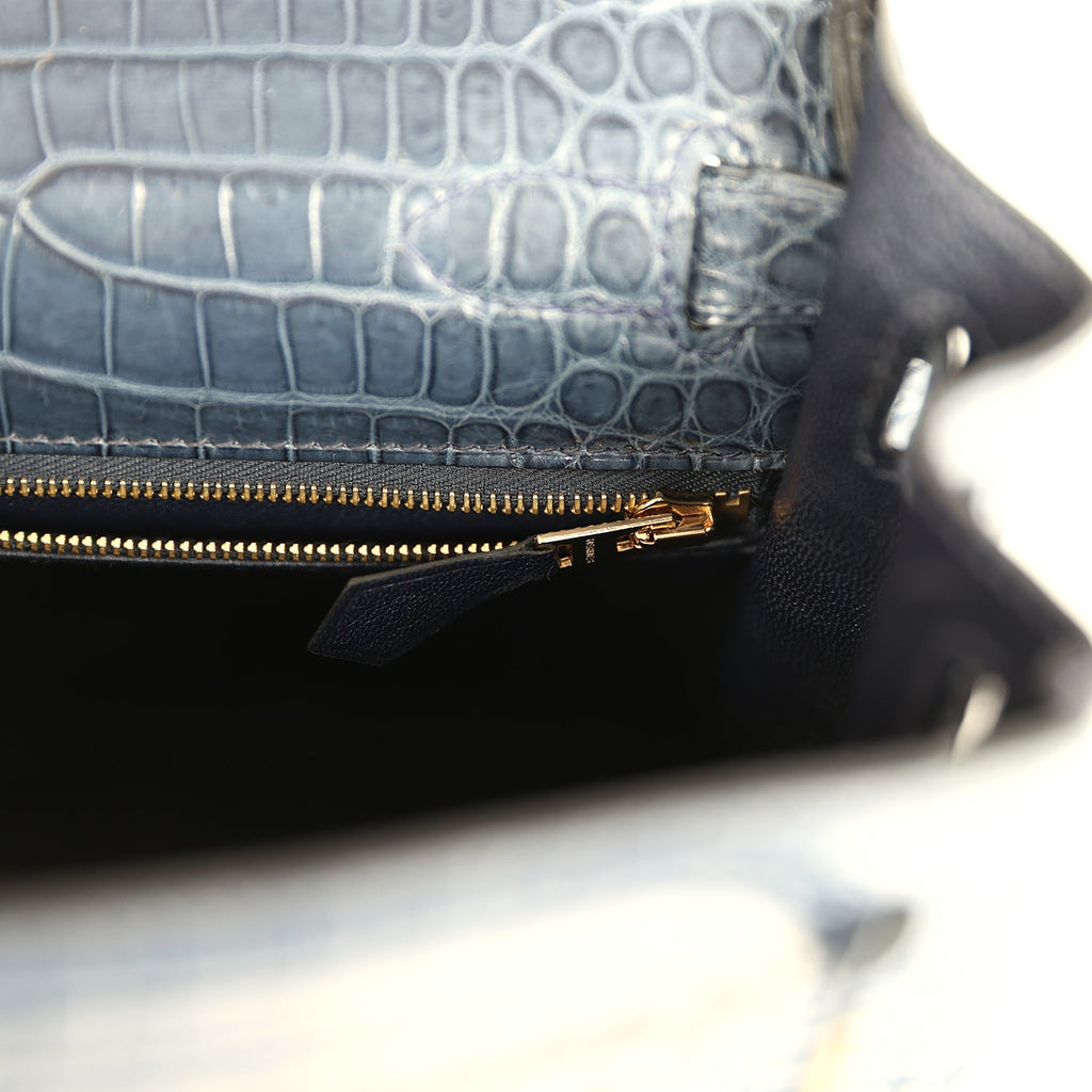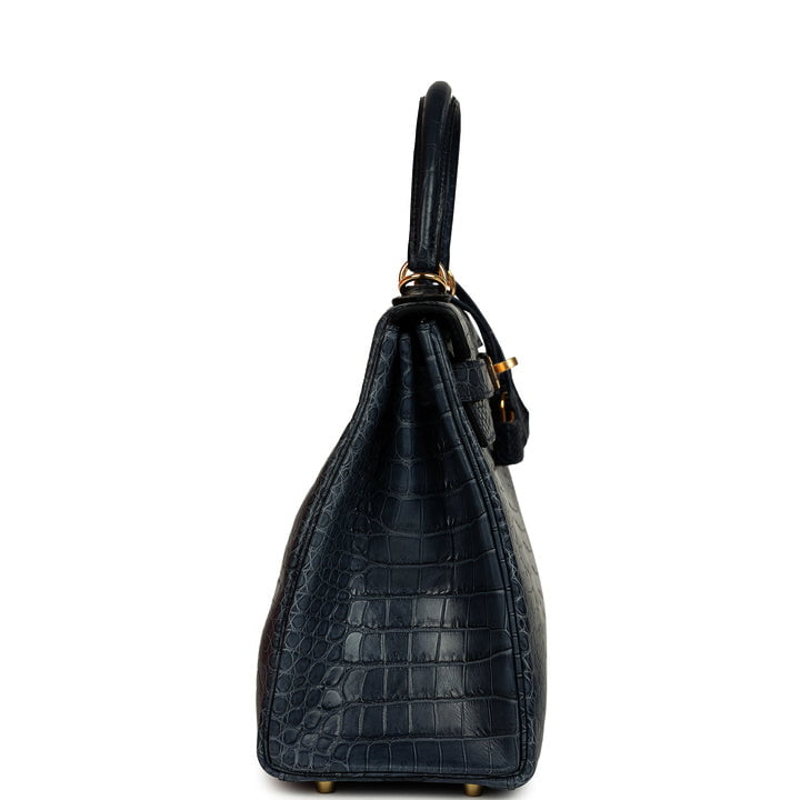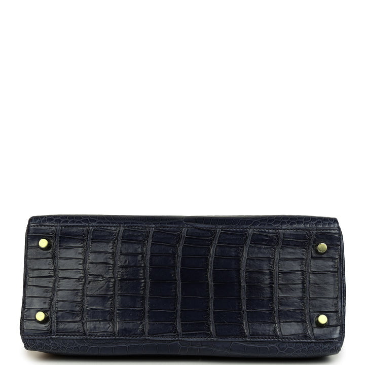 Hermes Kelly Retourne 28 Bleu Nuit Satin Matte Porosus Crocodile Gold Hardware