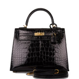 Hermes Kelly Sellier 25 Black Shiny Alligator Gold Hardware