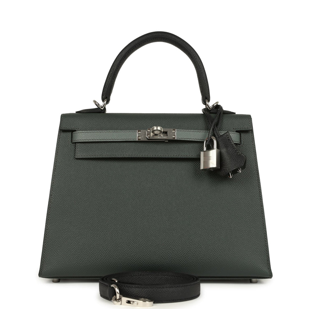 Hermes Kelly Sellier 25 Tri-Color Black, Vert Amande and Vert Mangrove Epsom Palladium Hardware