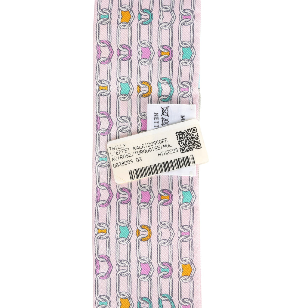 This Hermes "L' Effet Kaleidoscope" silk twilly is of Rose and Turquoise designed by Gianpaolo Pagni, in a mutli colorway.