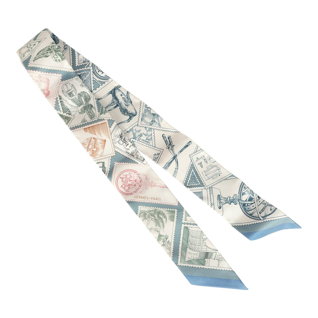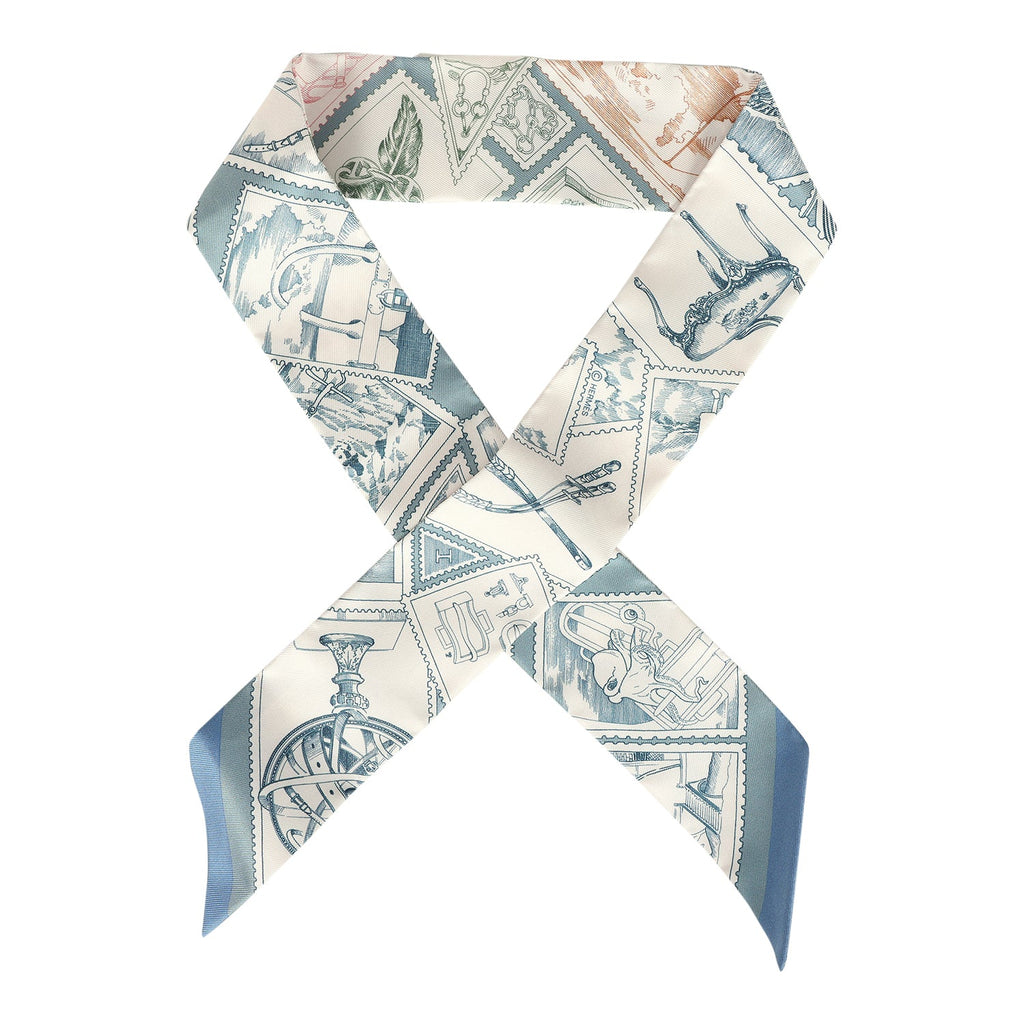 Hermes "Le Philateliste Du Faubourg" Bleu Moyen and Blanc Multi Silk Twilly Pair
