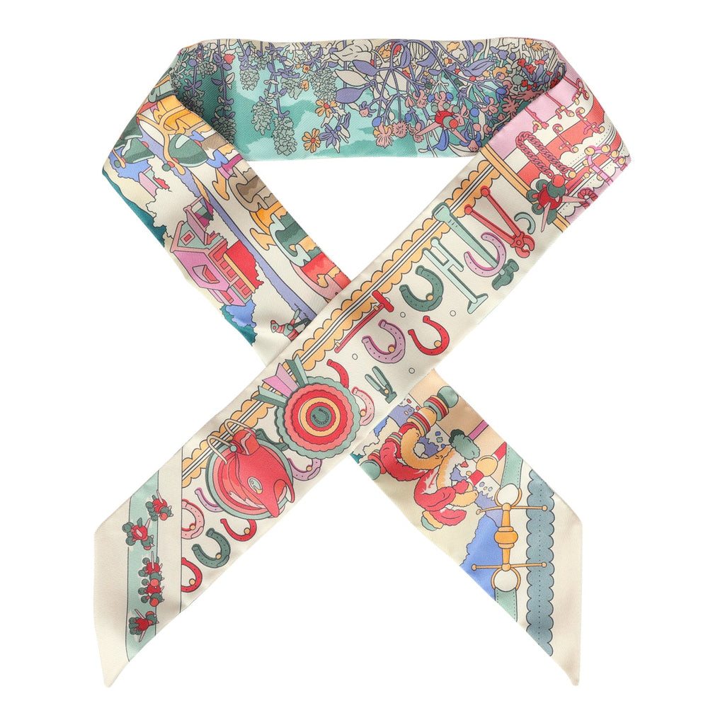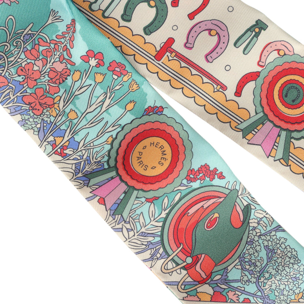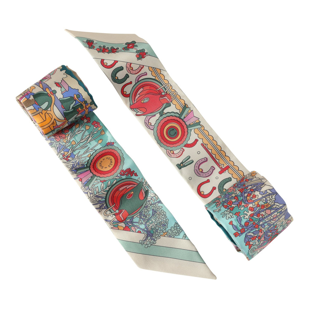 Hermes "Pony Pit Stop" Rose, Creme, Vert Silk Twilly Pair