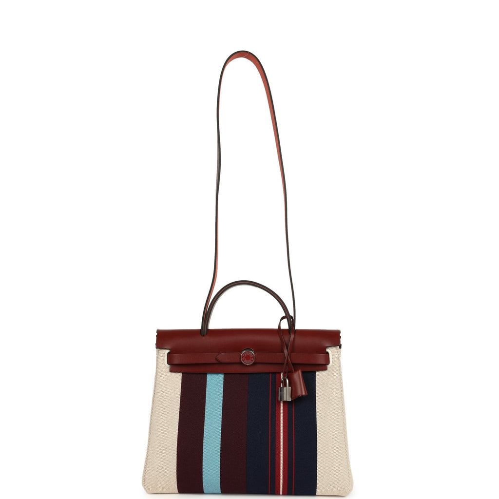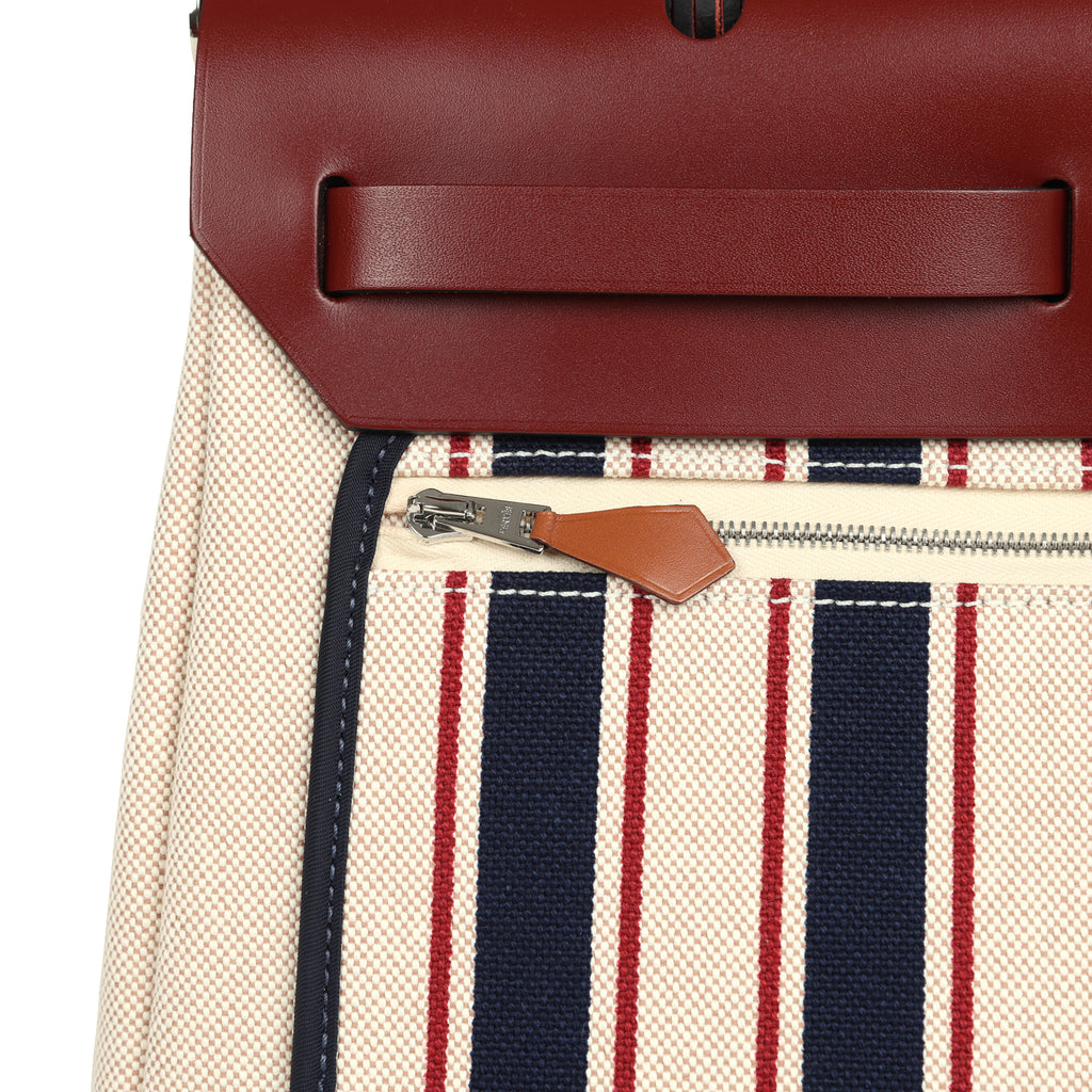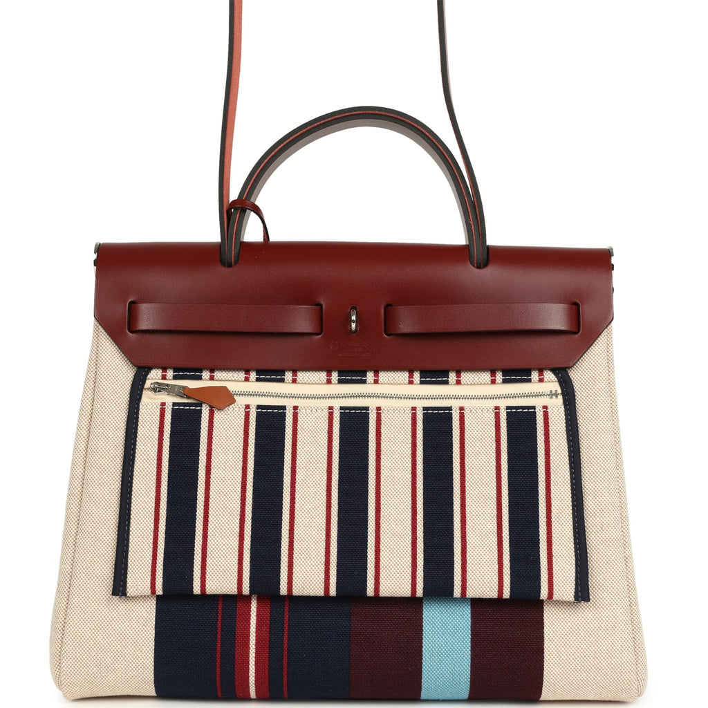 Hermes Special Order (HSS) Herbag Zip PM 31 "Striped" Rouge H Vache Hunter, Ecru, Bleu, Bordeaux and Beige Toile H Canvas Lacquered Palladium Hardware