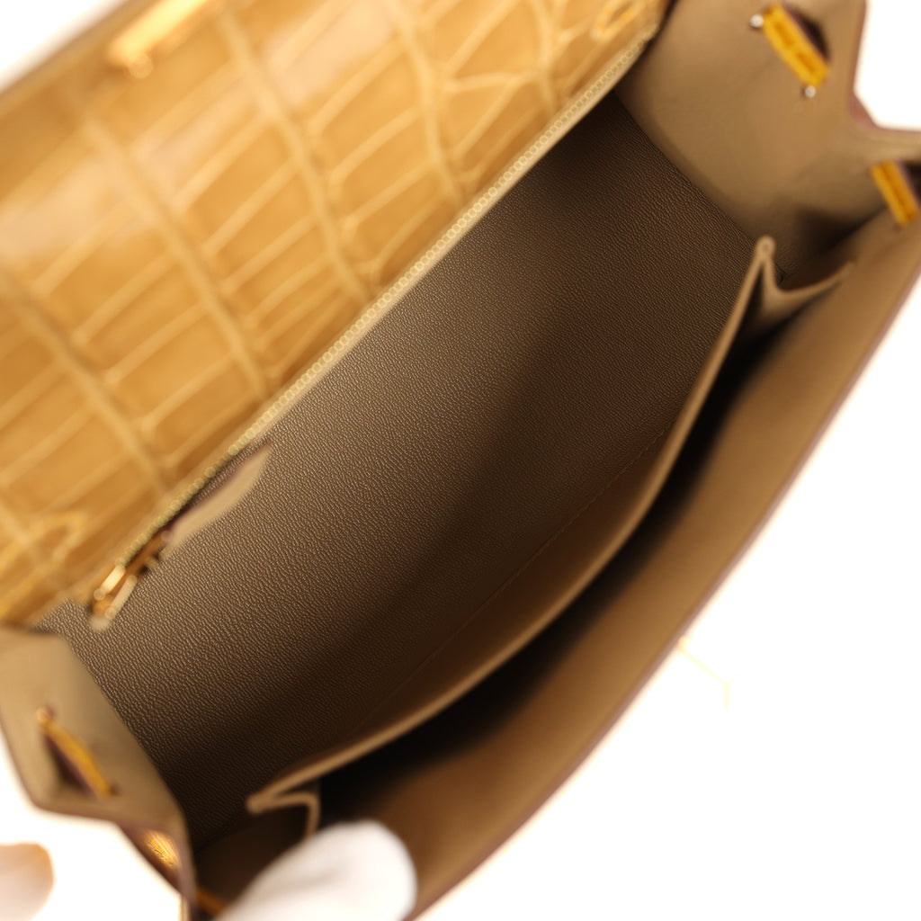 Hermes Special Order (HSS) Kelly Sellier 25 Beige Sable and Jaune Ambre Shiny Alligator Mississpiensis Brushed Gold Hardware